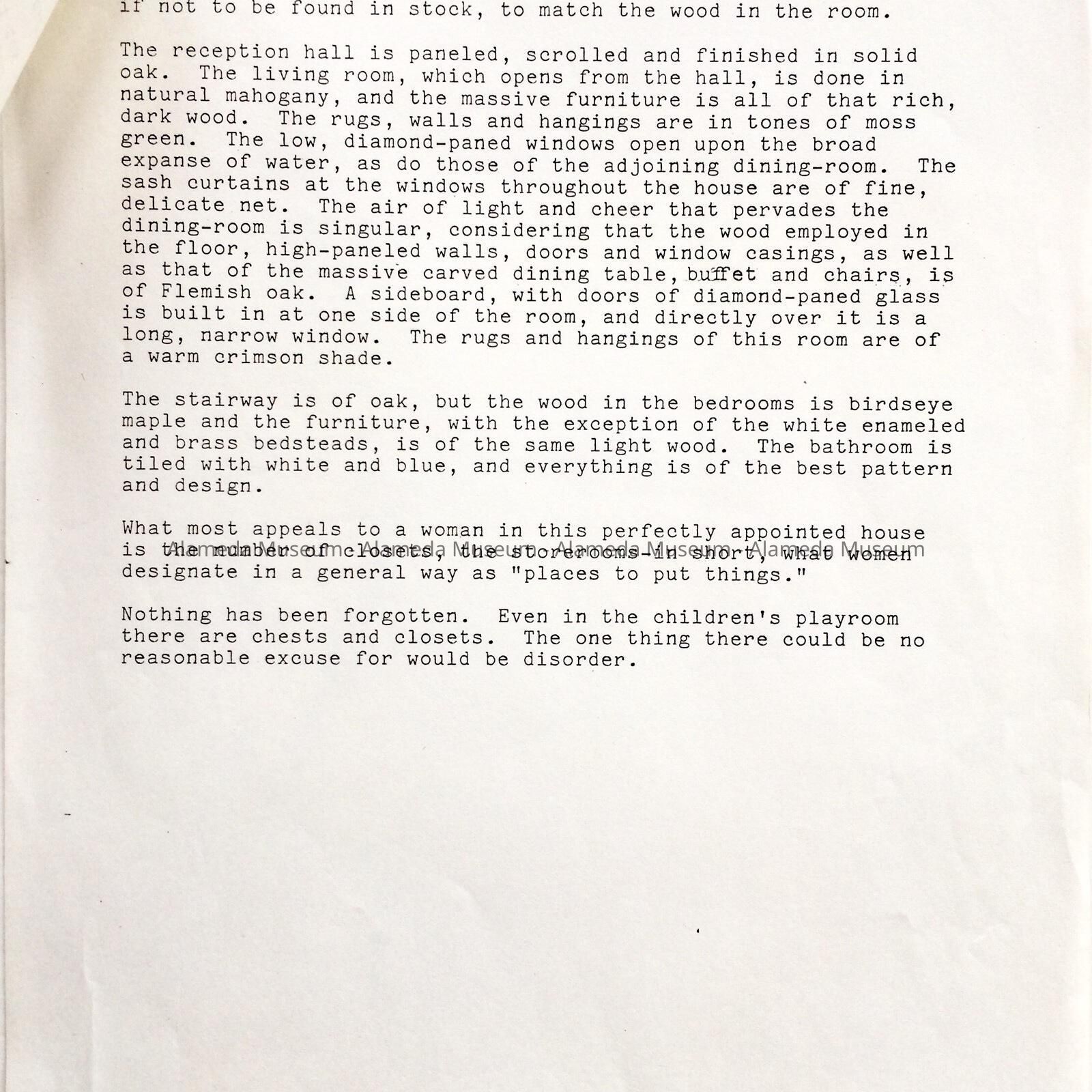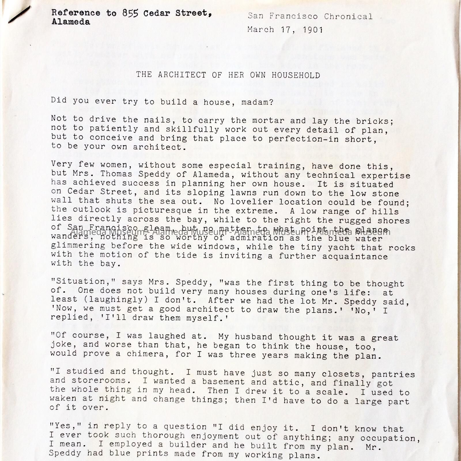 A newspaper article entitled, “The Architect of Her Own Household”, which appeared in the San Francisco Chronicle on March 17, 1901 concerning the home of Mrs. Thomas Speddy of 855 Cedar Street. Apparently from the article, Mrs. Speddy served as the architect of her residence here in Alameda.