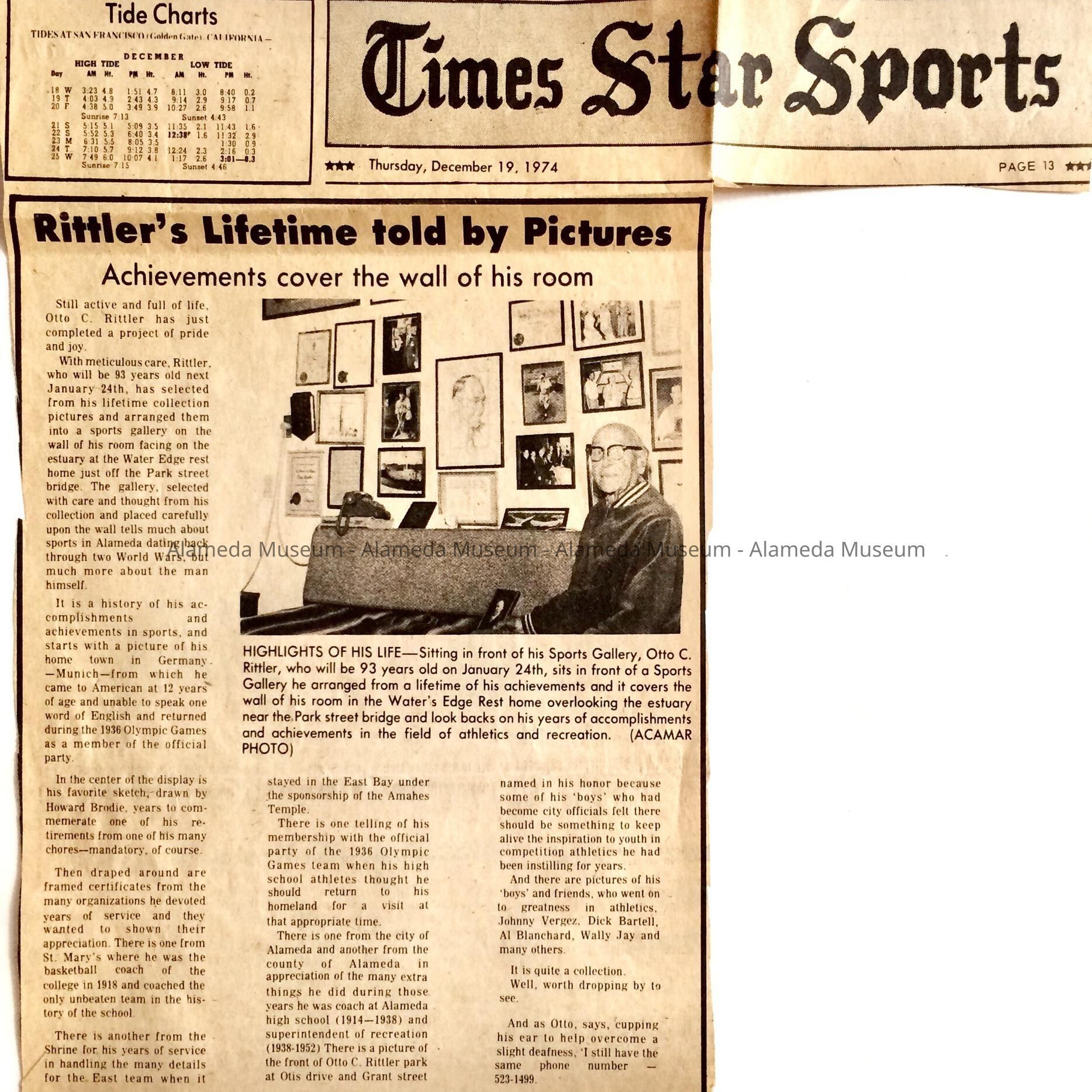 Illustrated article concerning the late Otto Rittler's career in sports. The article appeared in the Alameda Times Star on December 19, 1974.