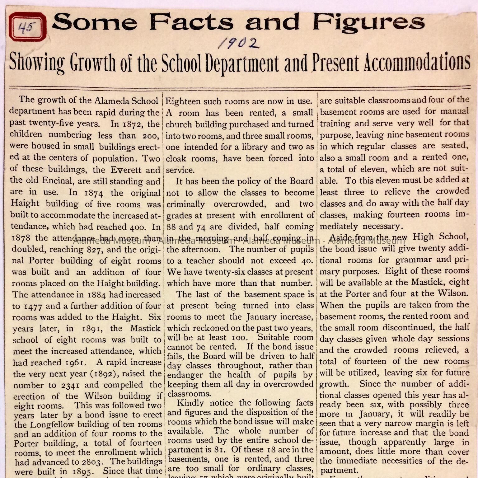 A FACT SHEET DISPLAYING THE GROWTH OF THE SCHOOL DEPARTMENT AND ITS ACCOMMODATIONS, BEGINNING IN 1872 TO 1902.