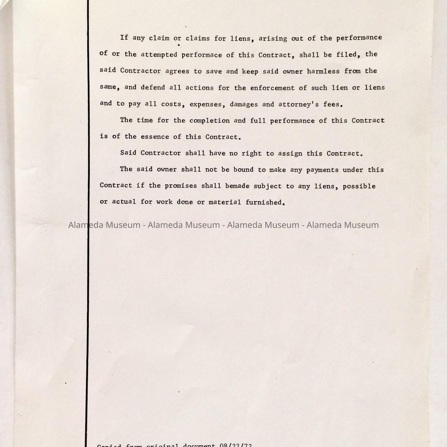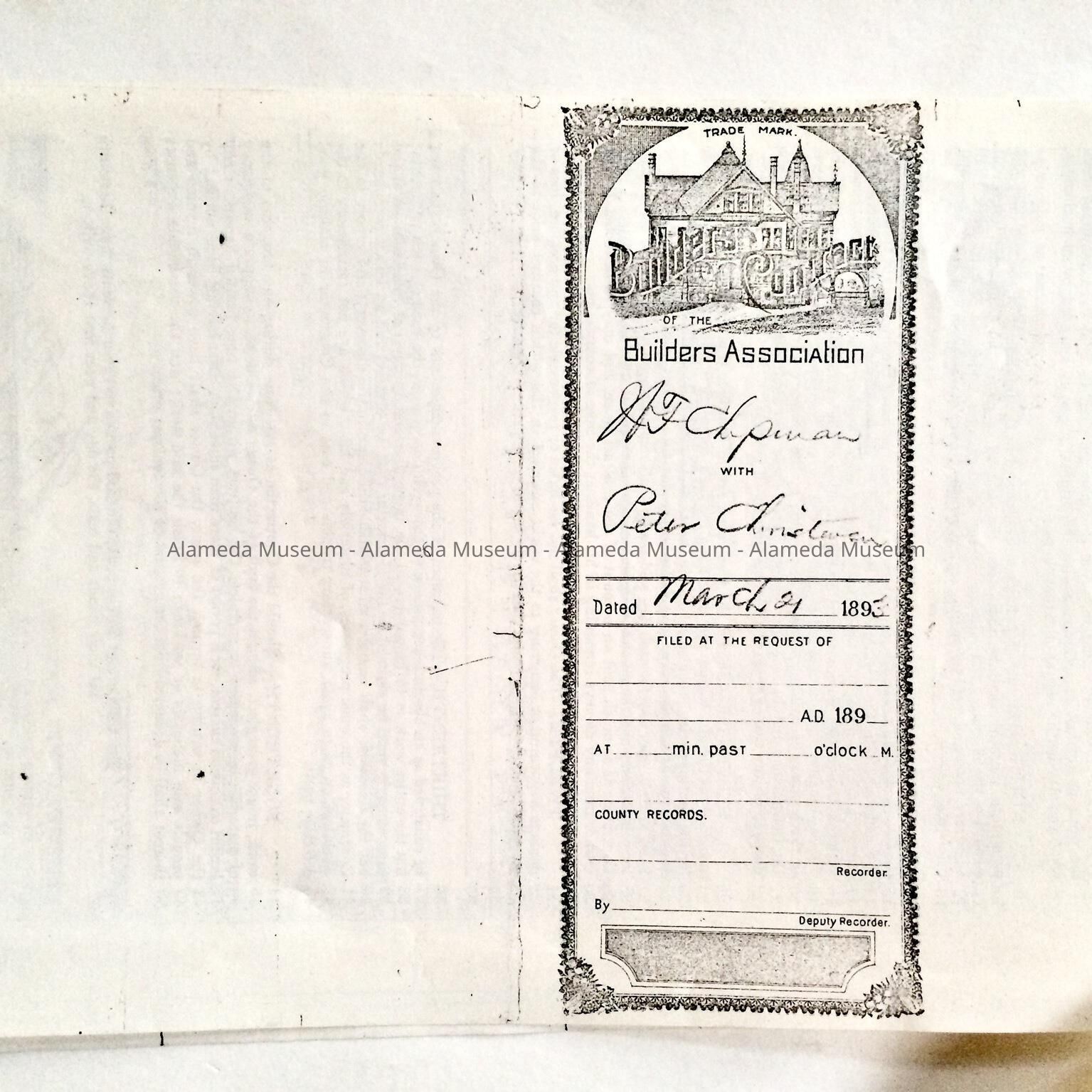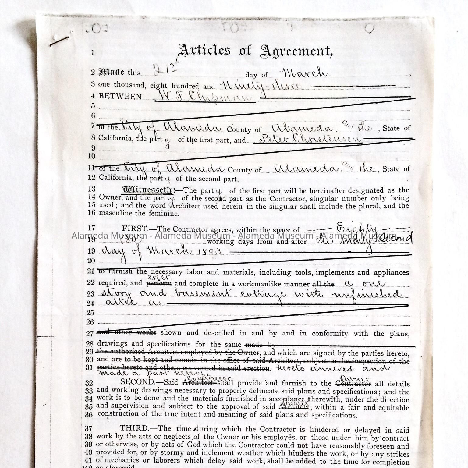 Articles of Agreement, dated March 21, 1893 between W.F. Chipman and Peter Christensen, builder, for the construction of a cottage and basement at 1290 Weber Street, which is still standing. The home was occupied by the Johnstad family from 1920 - 1972.
