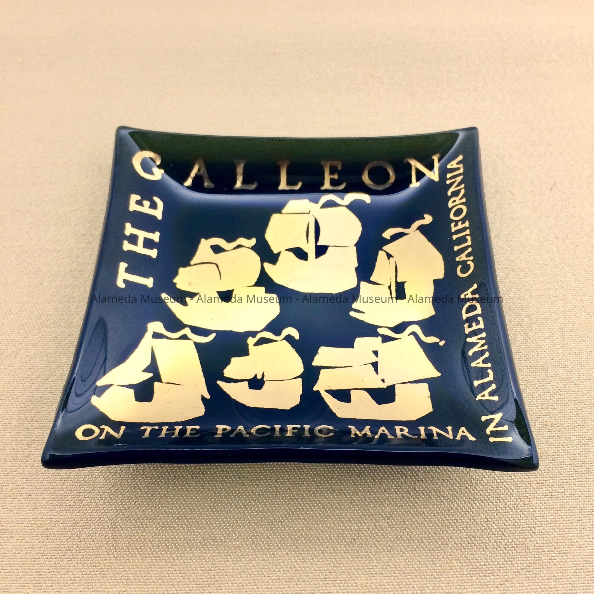 Description: Square ash tray of dark grey glass with design of 6 ships in gold and text 'The Galleon on the Pacific Marina, in Alameda California'