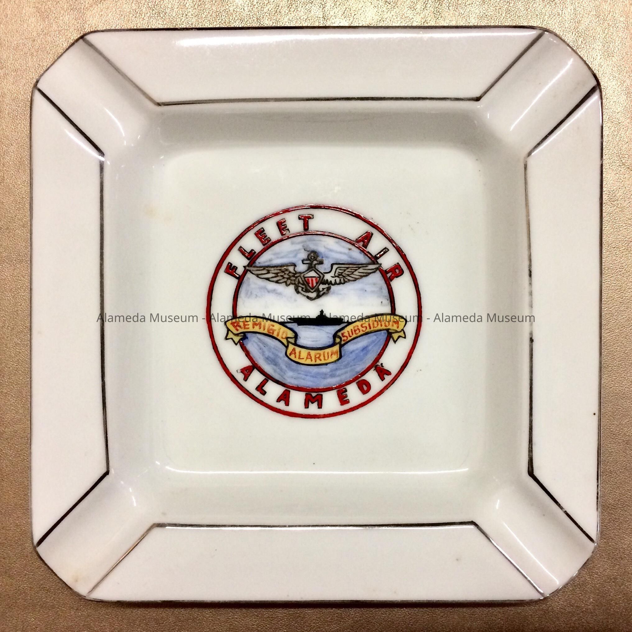 DESCRIPTION: A WHITE-COLORED SQUARE-SHAPED PORCELAIN ASHTRAY WITH INDENTED RIM FOR CIGARETTE(S) PLACEMENT. BASE OF THE ASHTRAY HAS AN EMBLEM WHICH STATES, "FLEET AIR, ALAMEDA" AND THE NAVAL INSIGNIA. THE EMBLEM IS A TRANSFER AND HAS BEEN ACCENTUATED BY HAND-PAINTING.