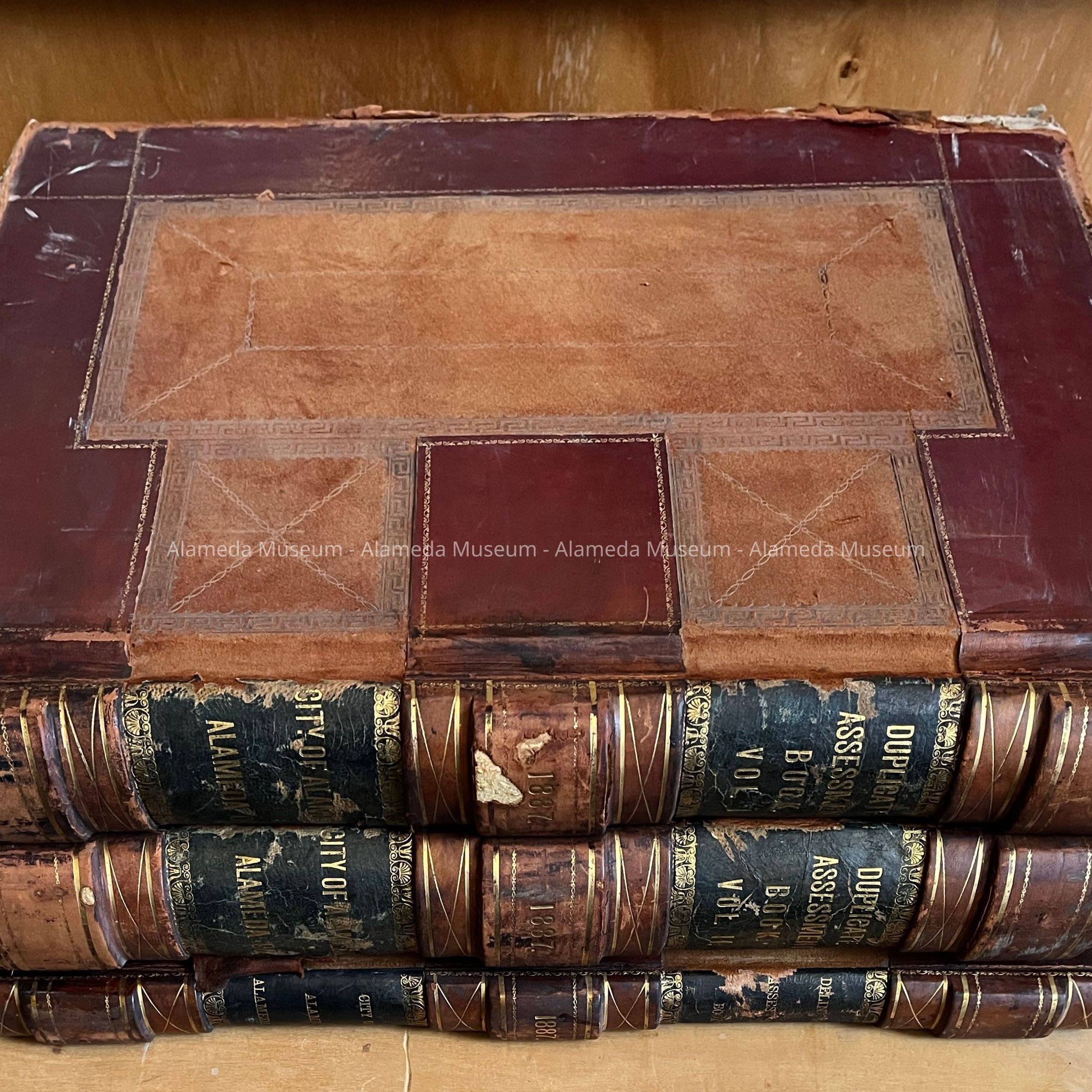 Description: Bound volume in red and brown colored leather, accentuated with gold.The spine of each record states: "Duplicate Assessment Book", the year, and "City" of Alameda". Each year's record comes with a supplemental volume labeled "Delinquent Assessor's Roll". All entries are hand-written on a printed form.