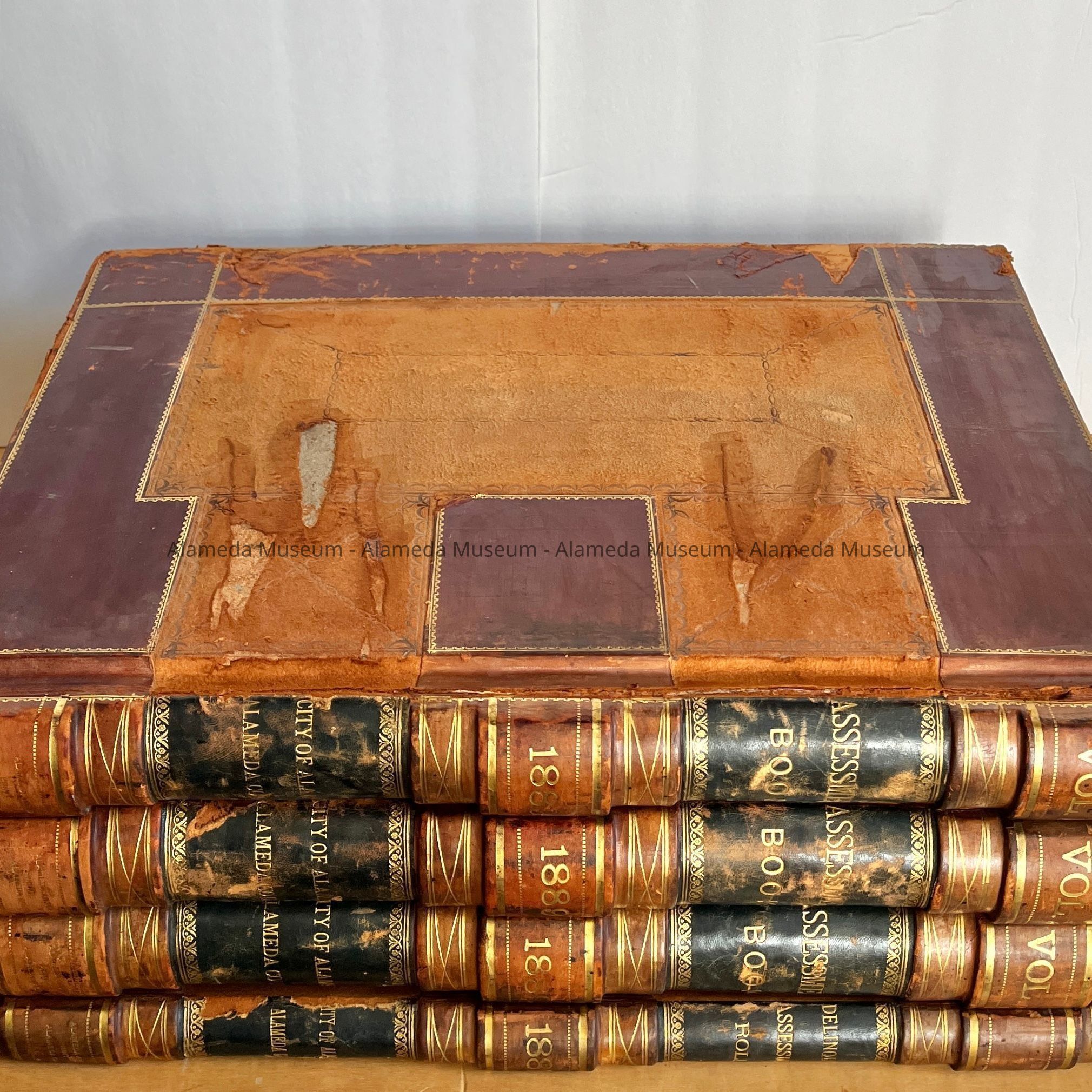 Description: Bound volume in red and brown colored leather, accentuated with gold.The spine of each record states: "Assessment Book", the year, and "City" of Alameda". Each year's record comes with a supplemental volume labeled "Delinquent Assessor's Roll". All entries are hand-written on a printed form.
