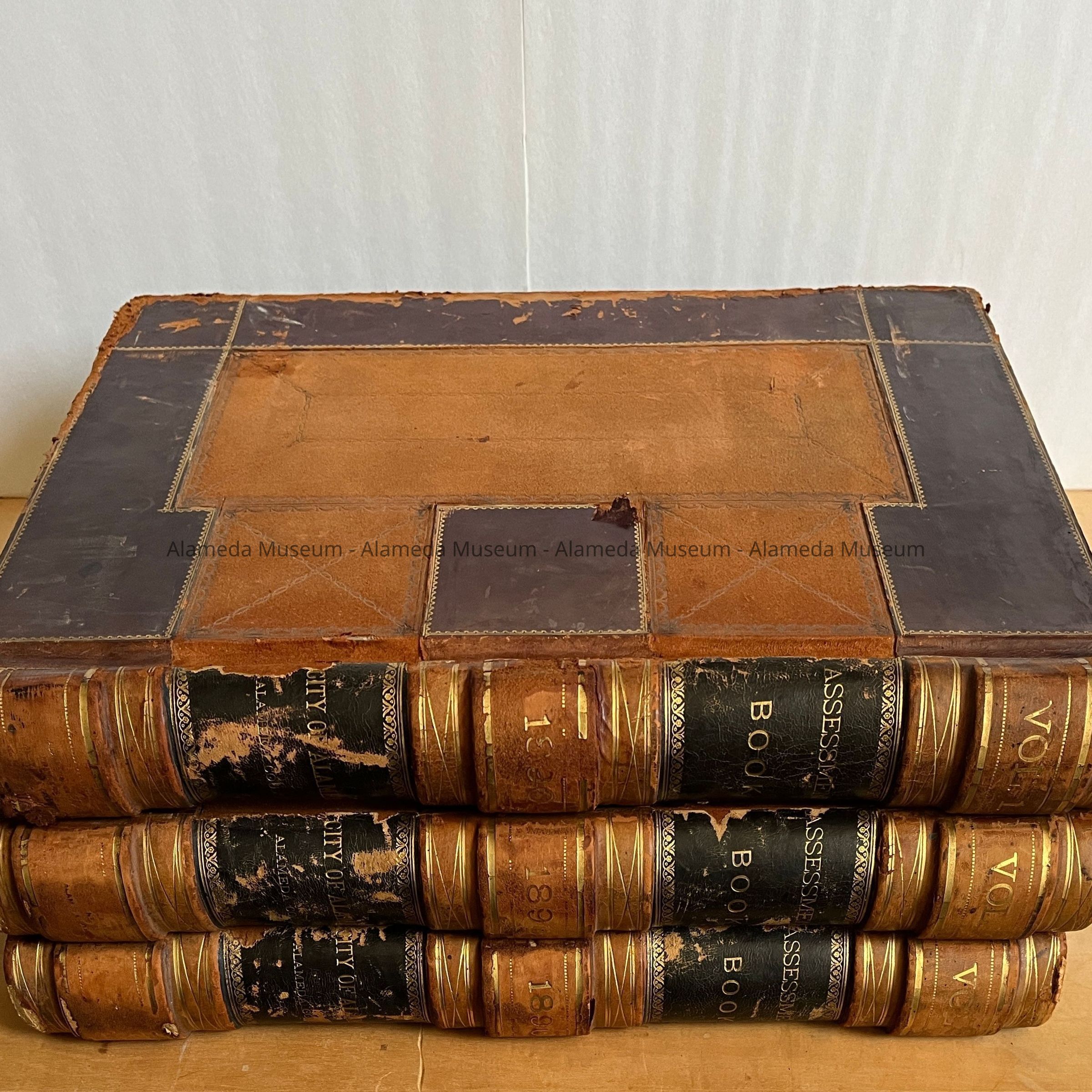 Description: Bound volume in red and brown colored leather, accentuated with gold. The spine of each record states: "Assessment Book", the year, and "City" of Alameda". Each year's record comes with a supplemental volume labeled "Delinquent Assessor's Roll" - for 1890, this volume is missing. All entries are hand-written on a printed form.