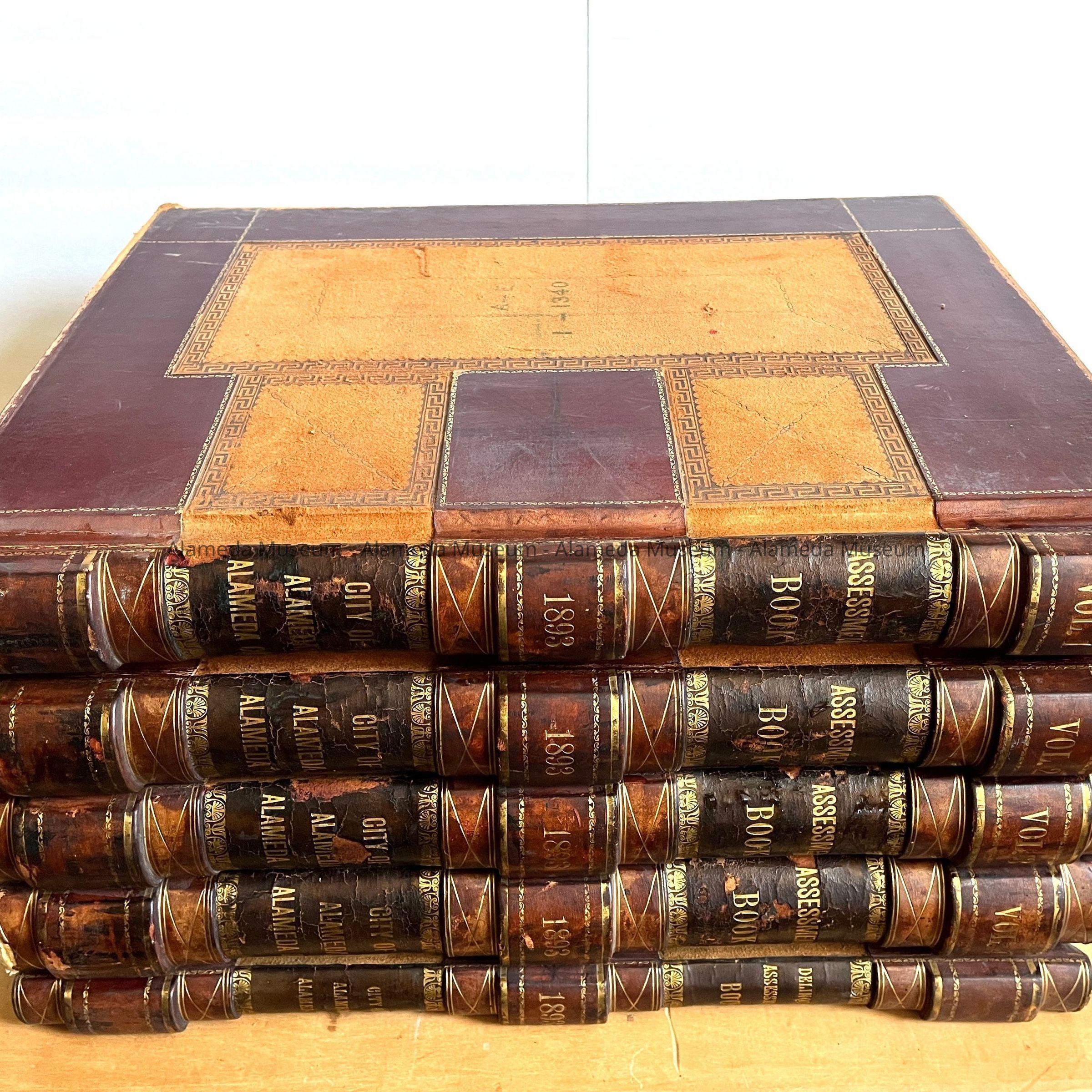 Description: Bound volume in red and brown colored leather, accentuated with gold.The spine of each record states: "Assessment Book", the year, and "City of Alameda". Each year's record comes with a supplemental volume labeled "Delinquent Assessor's Roll". All entries are hand-written on a printed form.