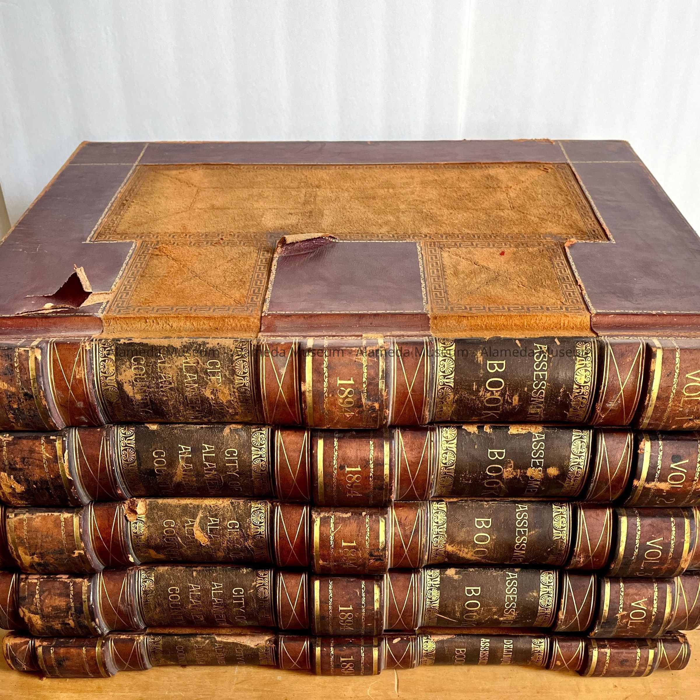 Description: Bound volume in red and brown colored leather, accentuated with gold. The spine of each record states: "Assessment Book", the year, and "Town (later "City") of Alameda". Each year's record comes with a supplemental volume labeled "Delinquent Assessor's Roll". All entries are hand-written on a printed form.