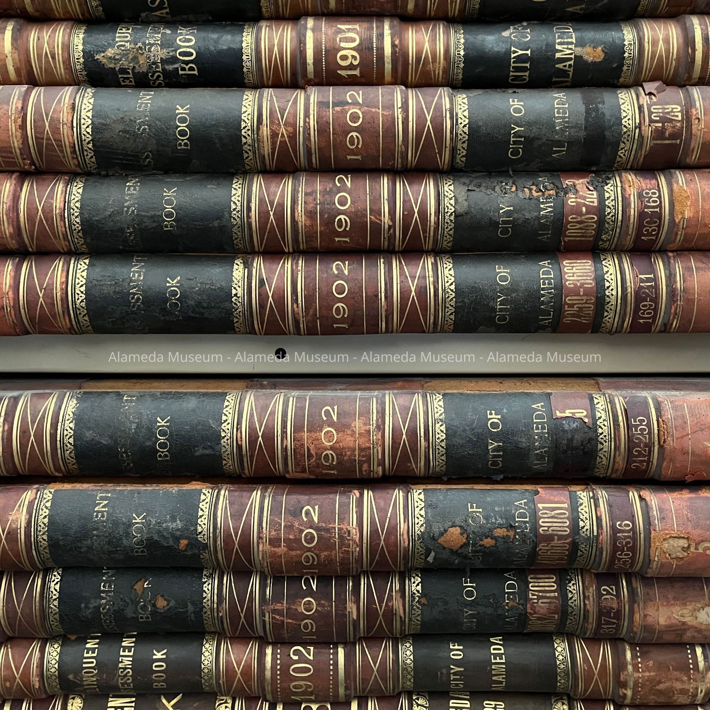Description: Bound volume in red and brown colored leather, accentuated with gold.The spine of each record states: "Assessment Book", the year, and "Town (later "City") of Alameda". Each year's record comes with a supplemental volume labeled "Delinquent Assessor's Roll". All entries are hand-written on a printed form.