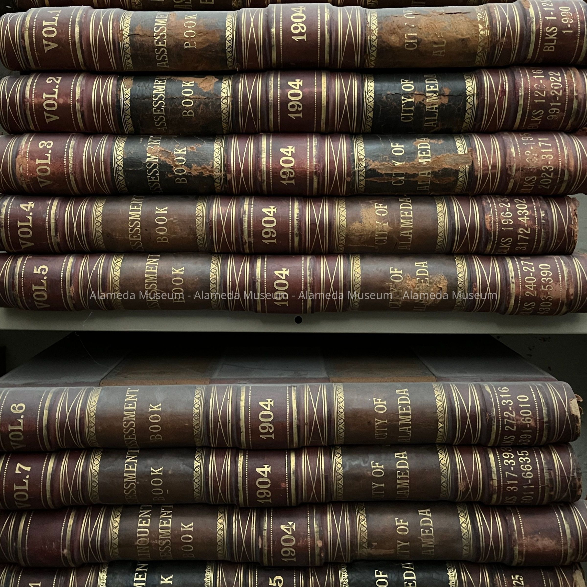 Description: Bound volume in red and brown colored leather, accentuated with gold. The spine of each record states: "Assessment Book", the year, and "Town (later "City") of Alameda". Each year's record comes with a supplemental volume labeled "Delinquent Assessor's Roll". All entries are hand-written on a printed form.