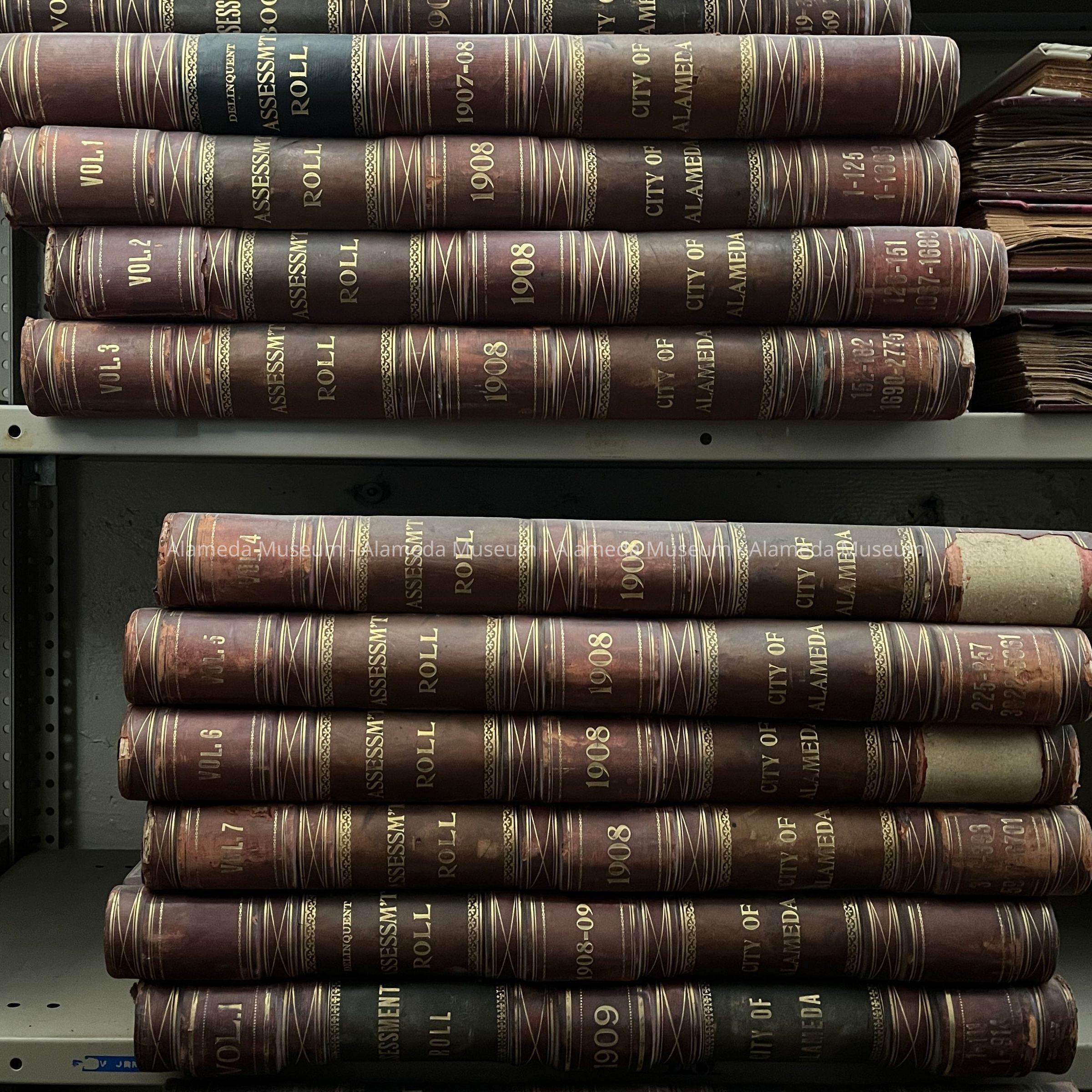 Description: Bound volume in red and brown colored leather, accentuated with gold. The spine of each record states: "Assessment Book", the year, and "Town (later "City") of Alameda". Each year's record comes with a supplemental volume-labeled "Delinquent Assessor's Roll". All entries are hand-written on a printed form. Size of each volume: (approximately) L-21 1/2” x W-17 1/2”