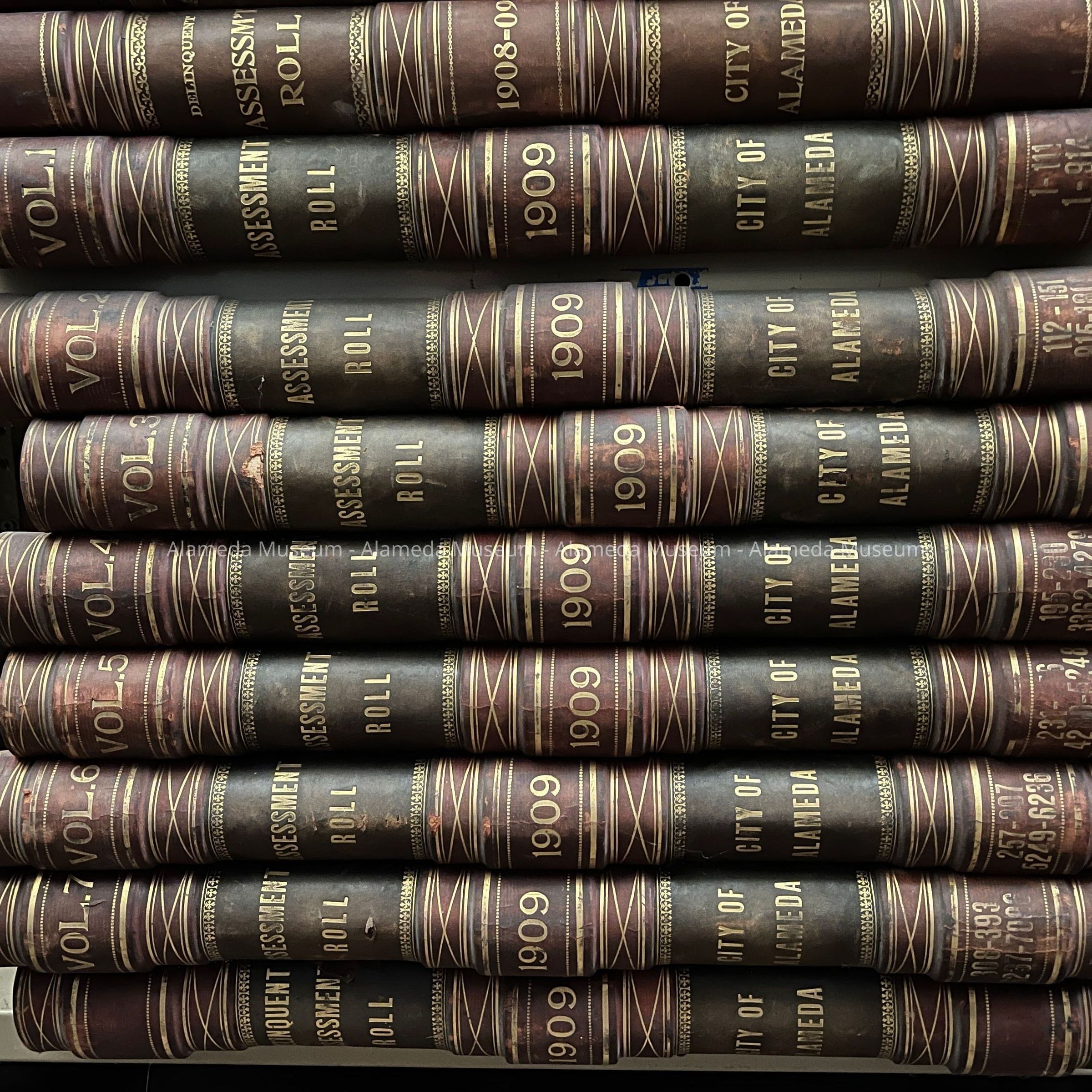 Description: Bound volume in red and brown colored leather, accentuated with gold. The spine of each record states: "Assessment Book", the year, and "Town (later "City") of Alameda". Each year's record comes with a supplemental volume labeled "Delinquent Assessor's Roll". All entries are hand-written on a printed form.