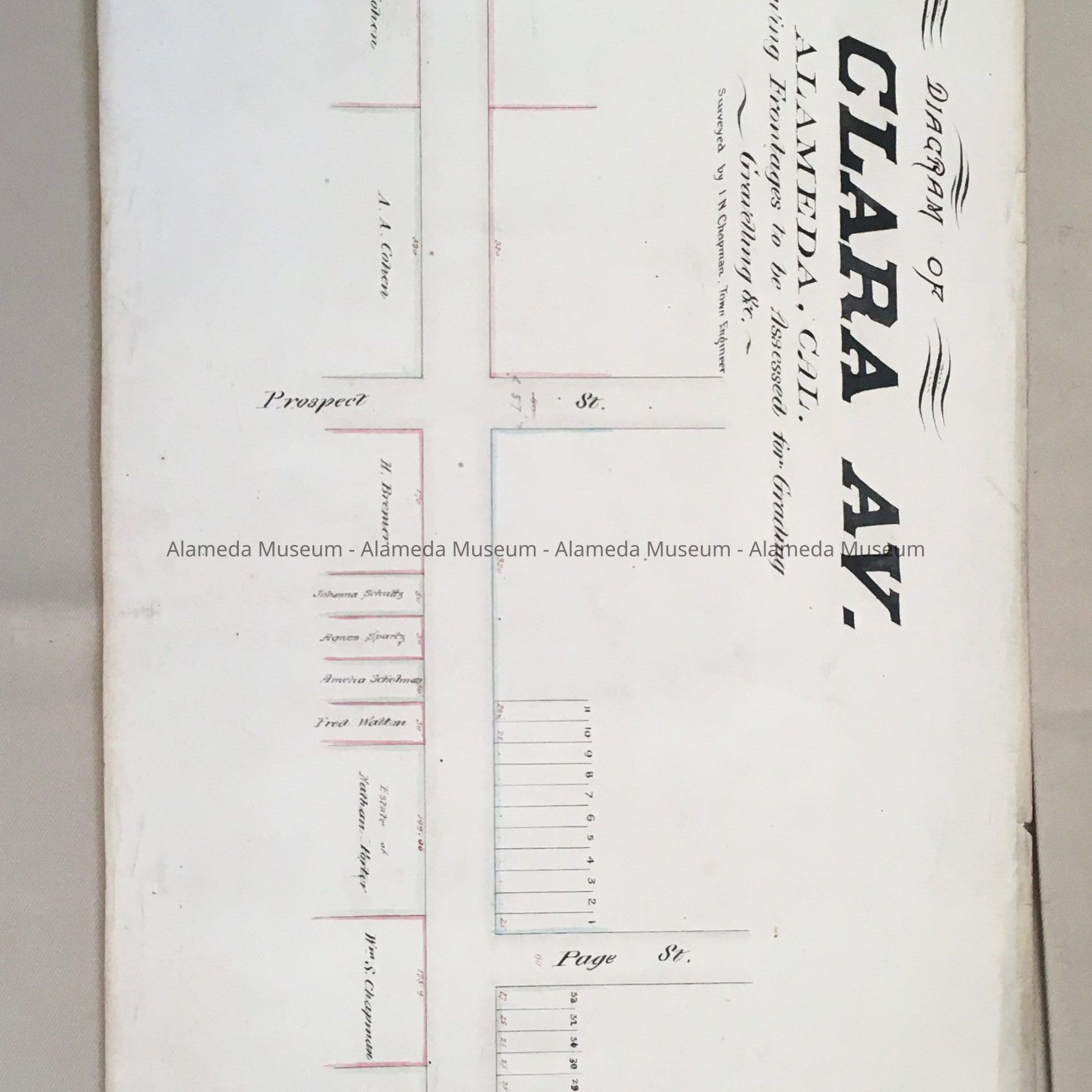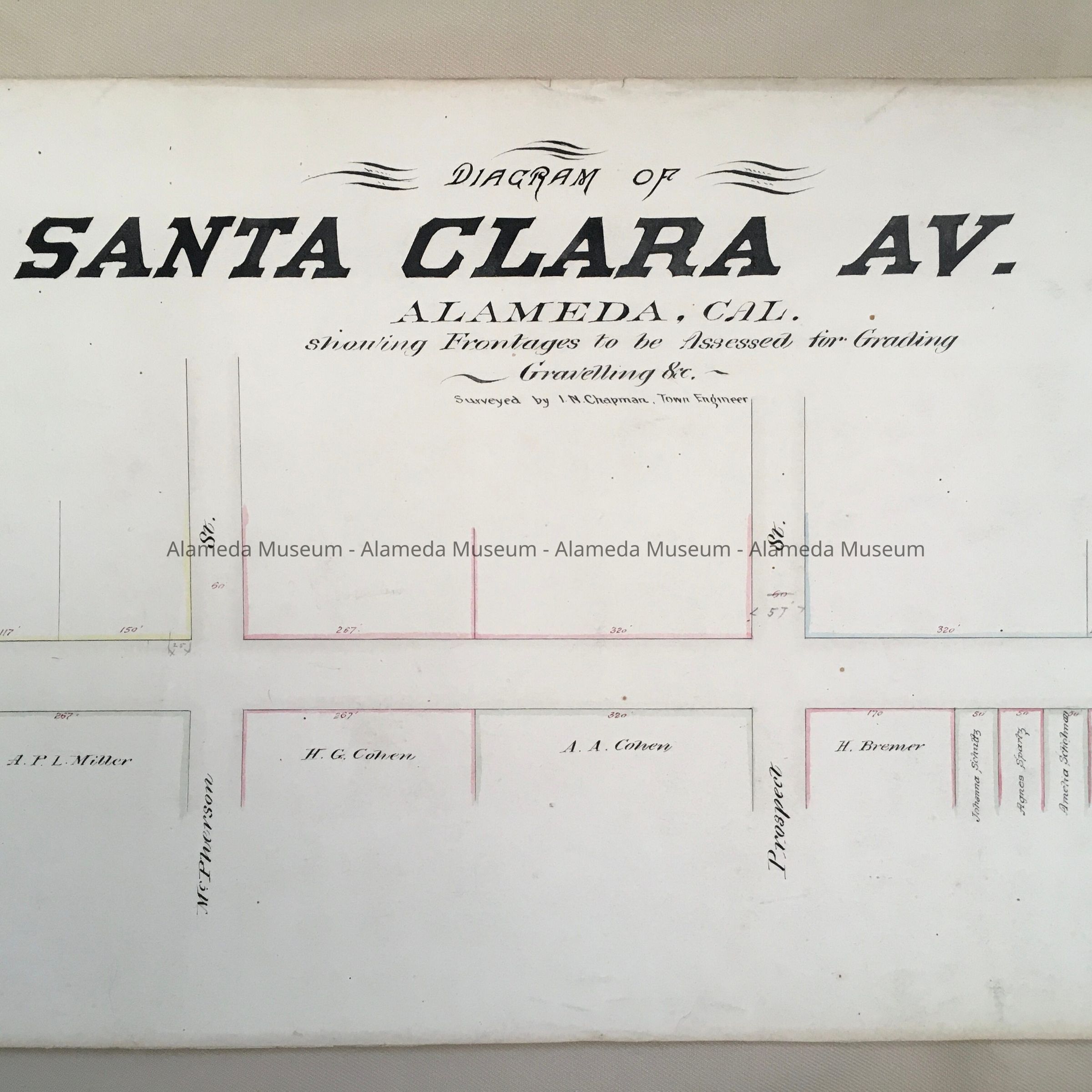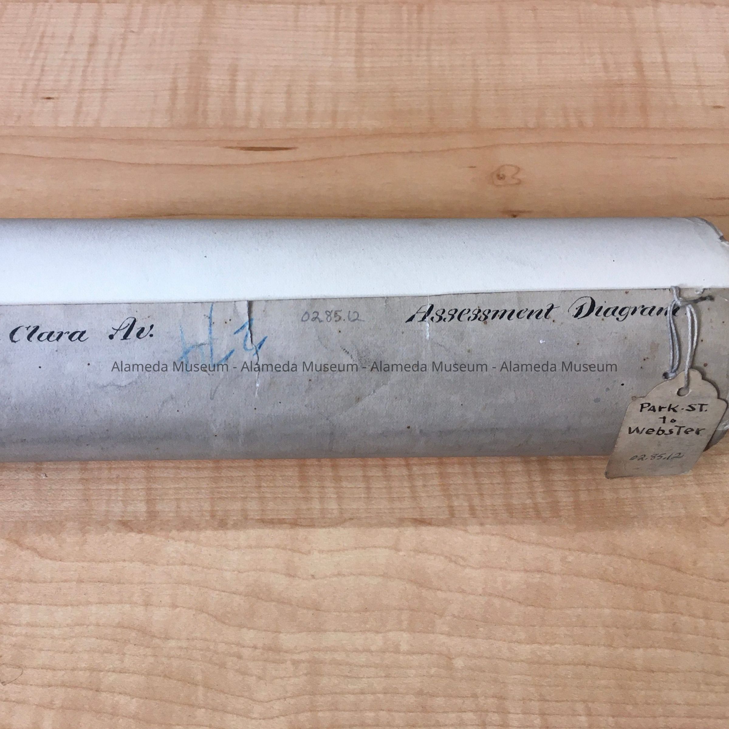 Long, narrow diagram, rolled up into a scroll, with written in ink on the edge of the roll: 'Santa Clara Av.' and 'Assessment Diagram'. An attached tag, which may be original, states 'Park .St. to Webster'. In blue pencil, upside down, is written the number 274. Inside is printed in ink: 'Diagram of/Santa Clara/ALAMEDA, CAL./Showing Frontages to be Assessed for Grading/ Gravelling Etc./Surveyed by I.N. Chapman, Town Engineer'.