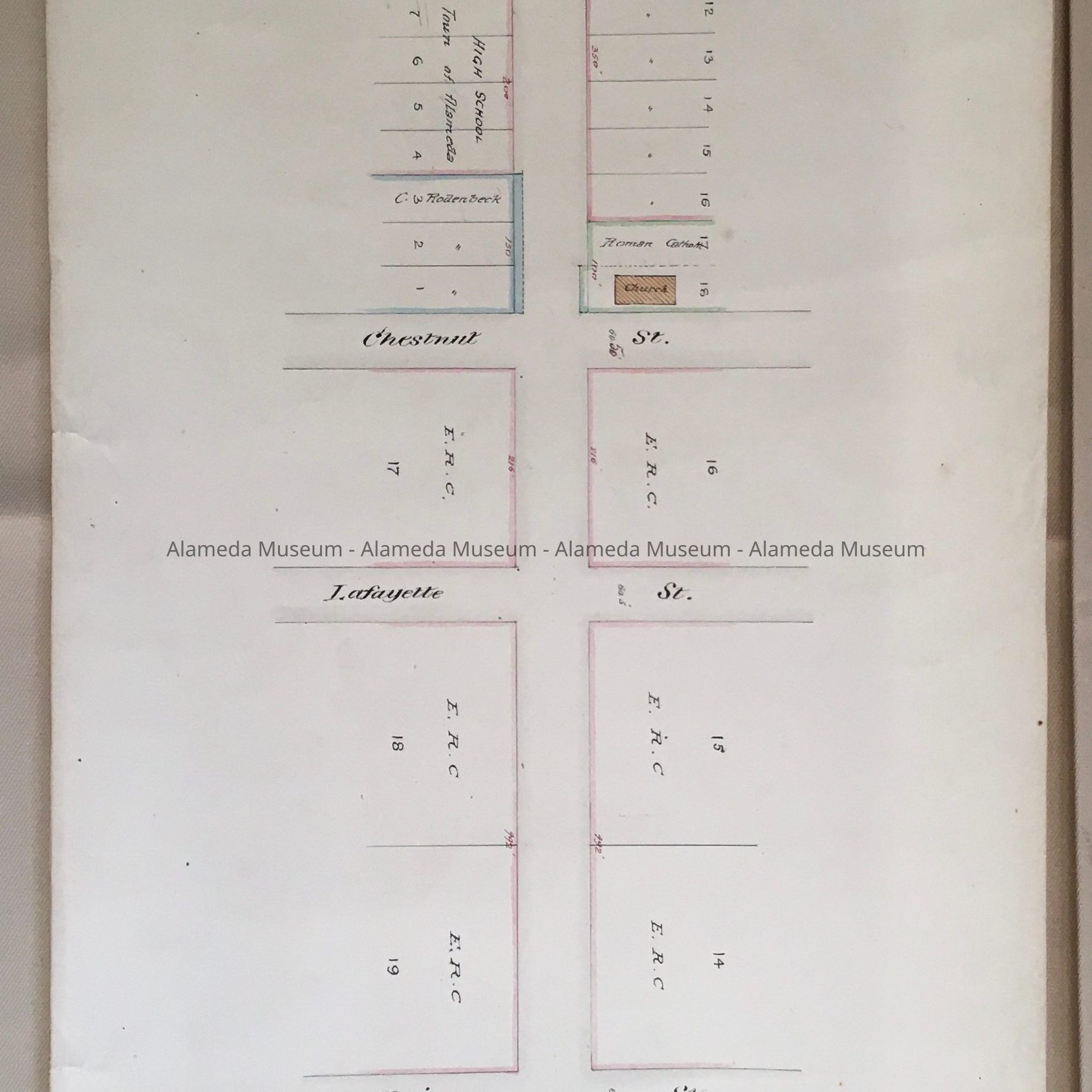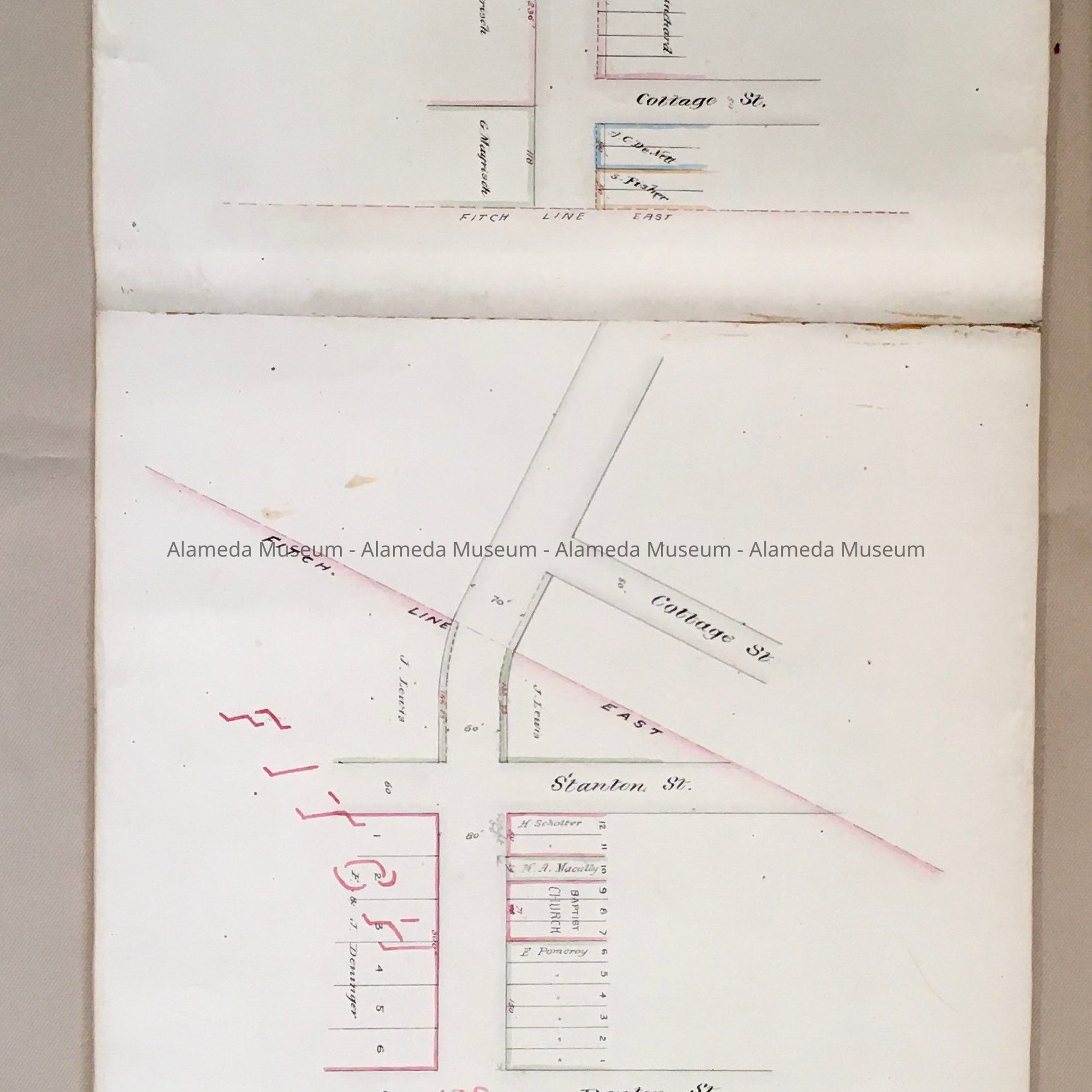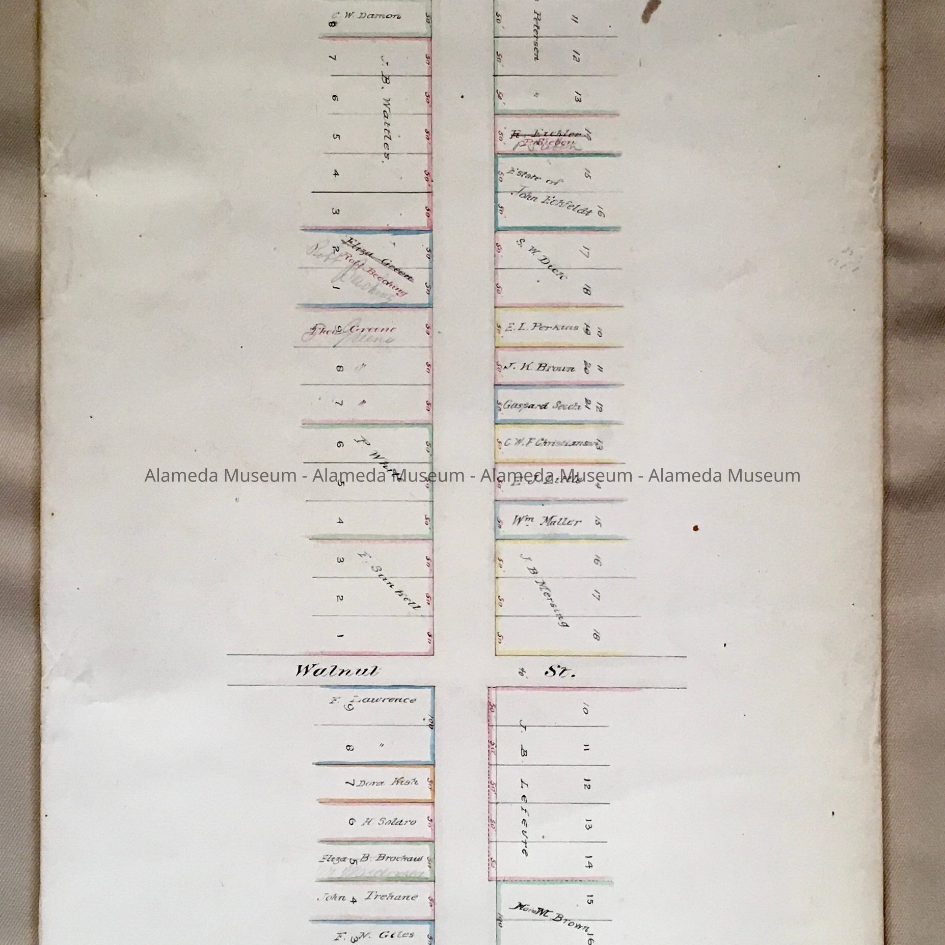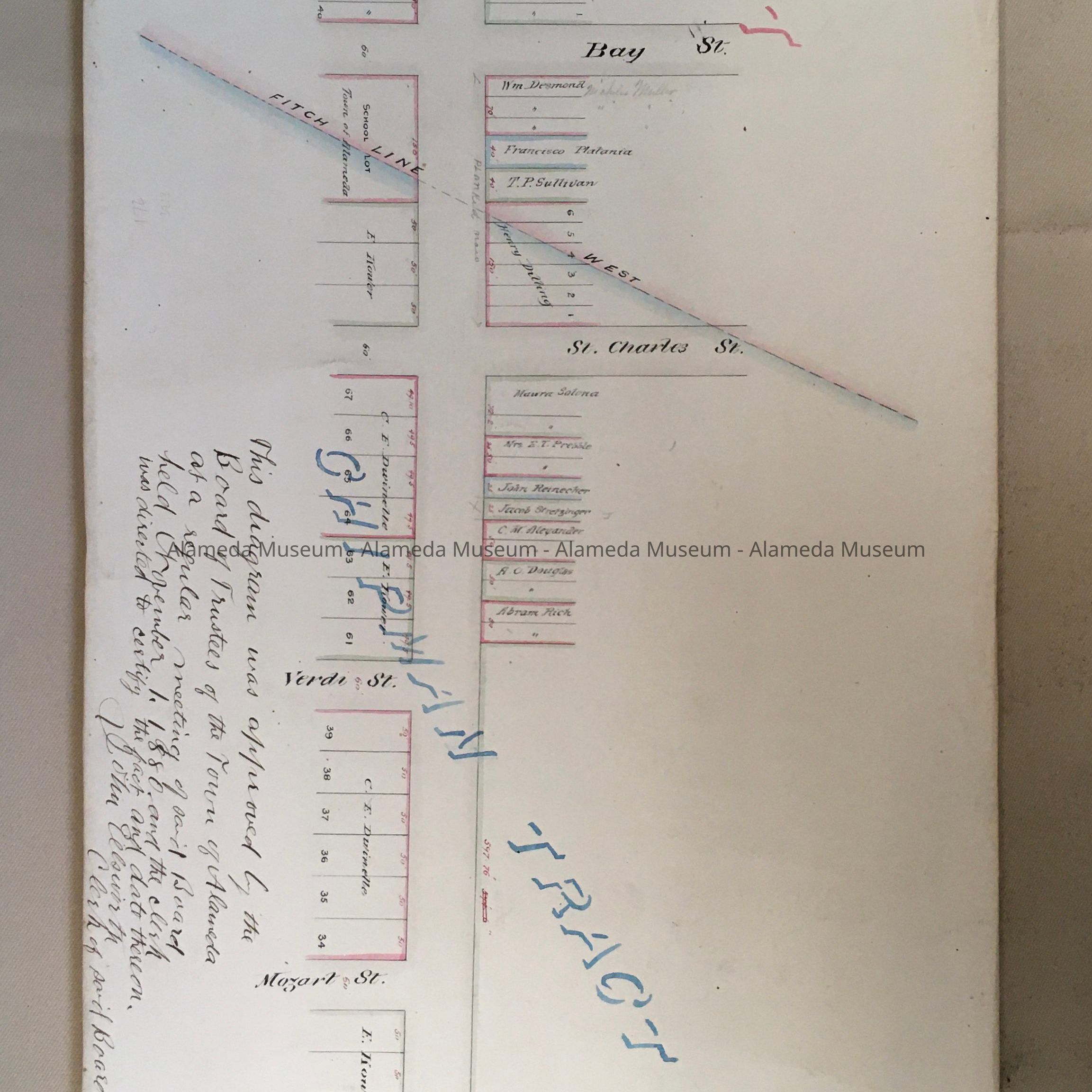 History of Object: Assessment Diagram showing Santa Clara from Park Street to Webster, created by the town engineer, approved by the Board of Trustees on November 1, 1880. The Diagram shows lots with numbers, sizes, and owner's names, some with corrections in red, and pencil, as well as cross streets.