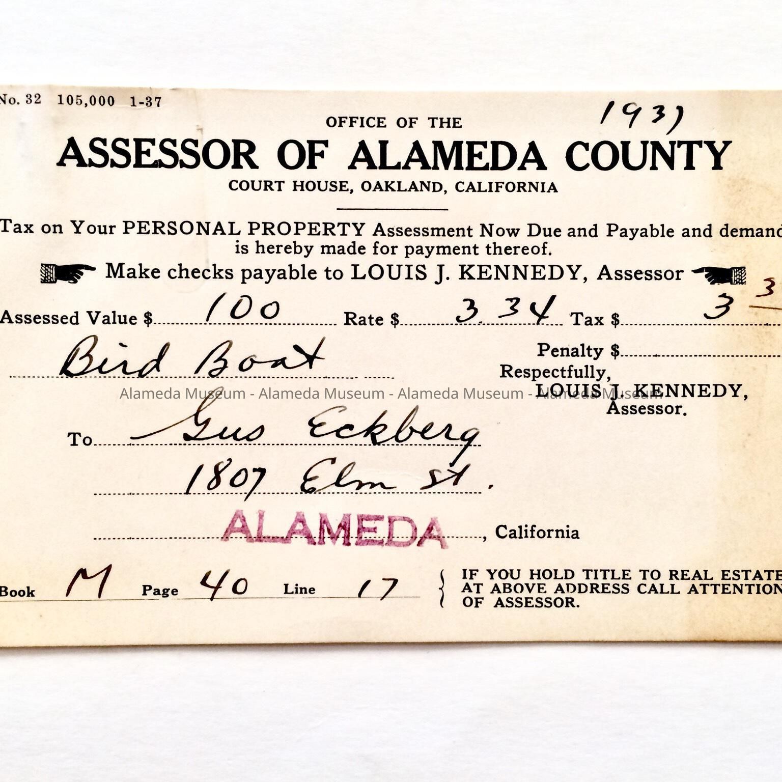 HISTORY OF OBJECT: AN ASSESSOR'S EVALUATION OF PERSONAL PROPERTY, CONSISTING OF A BIRD BOAT OWNED BY GUS EKBERG OF 1807 ELM STREET, ALAMEDA, CA.