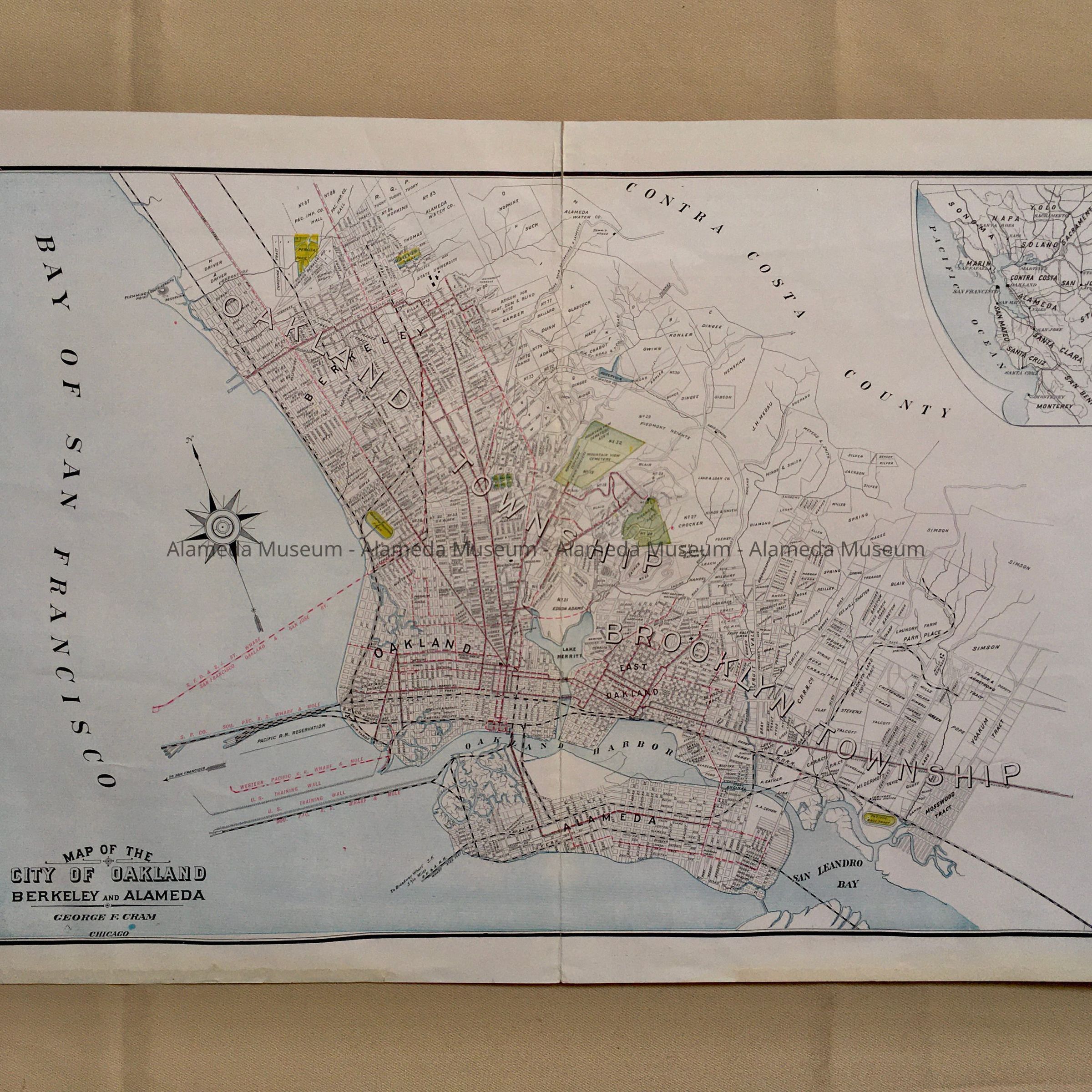 A 2-SIDED MAP THAT APPEARS TO HAVE BEEN REMOVED FROM AN ATLAS, WITH THE CAPTION, "MAP OF THE CITIES OF OAKLAND, BERKELEY, AND ALAMEDA, GEORGE CRANE, CHICAGO, PRINTER."