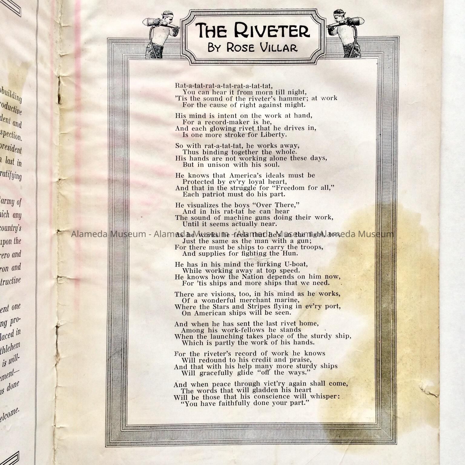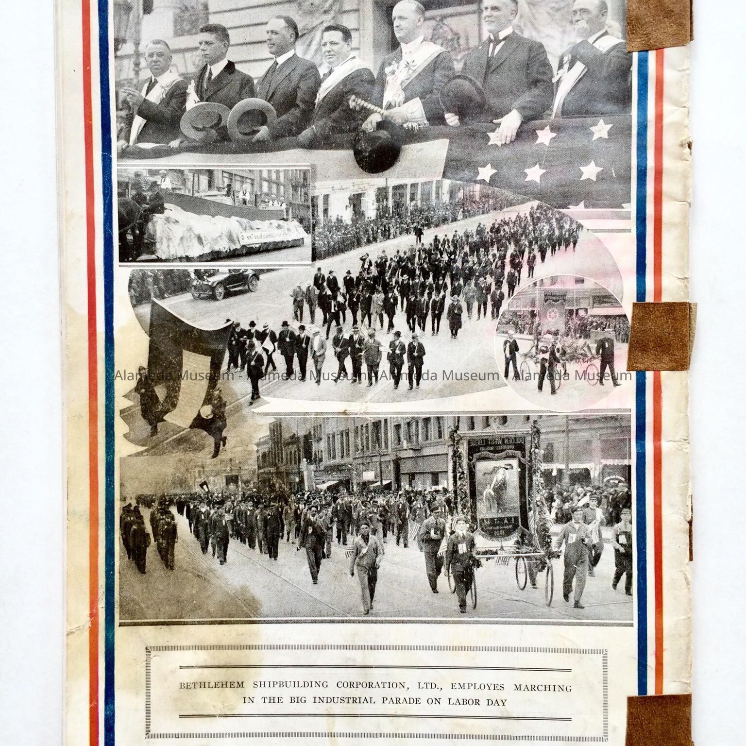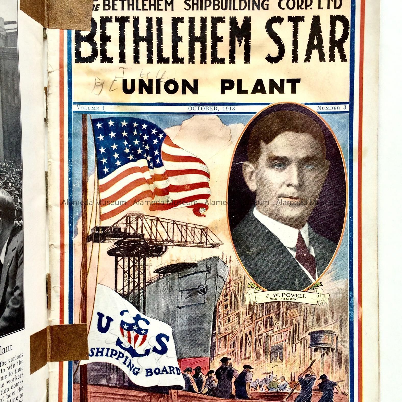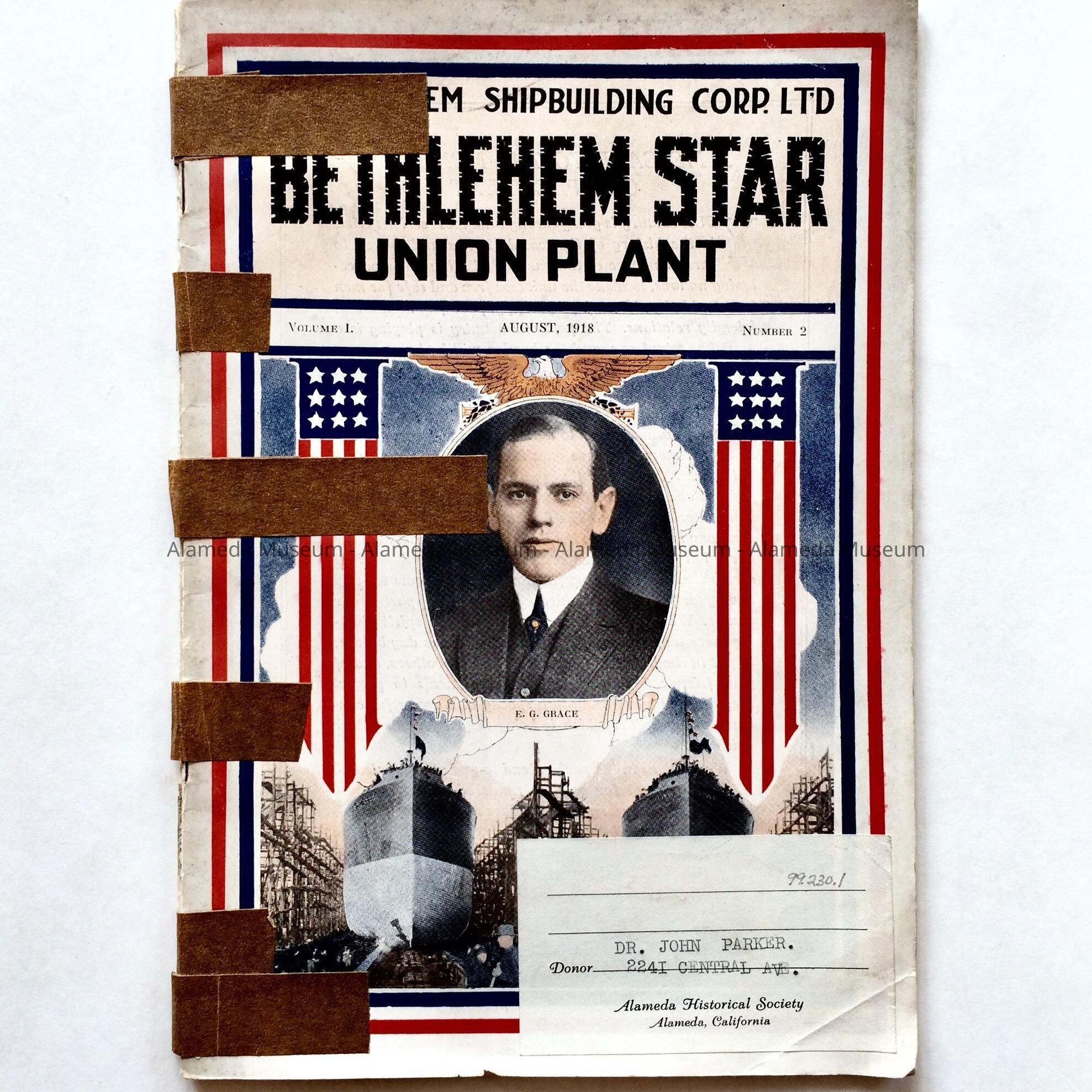 History: The August 1918 edition of the Bethlehem Star published for the employees of the Bethlehem Shipyard Corp. Ltd. On page 13 is an article about the Alameda yard of Bethlehem and is illustrated with the launching of ships. Given prior to 1971, #190, and never catalogued.