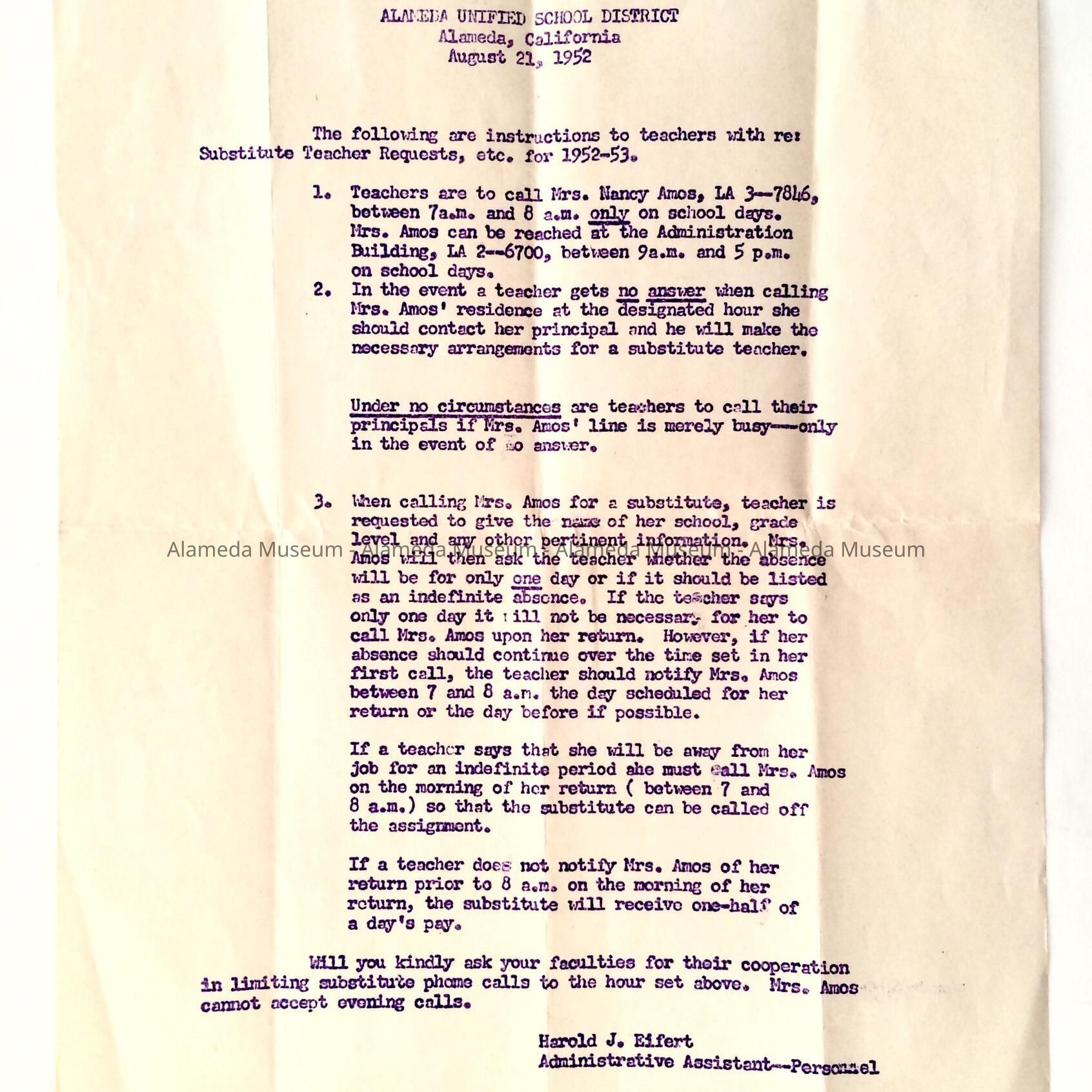 Description: mimeographed copy of typed information, titled 'Alameda Unified School District, Alameda, California, August 21, 1952. Typed signature Harold J. Eifert, Administrative Assistant--Personnel.