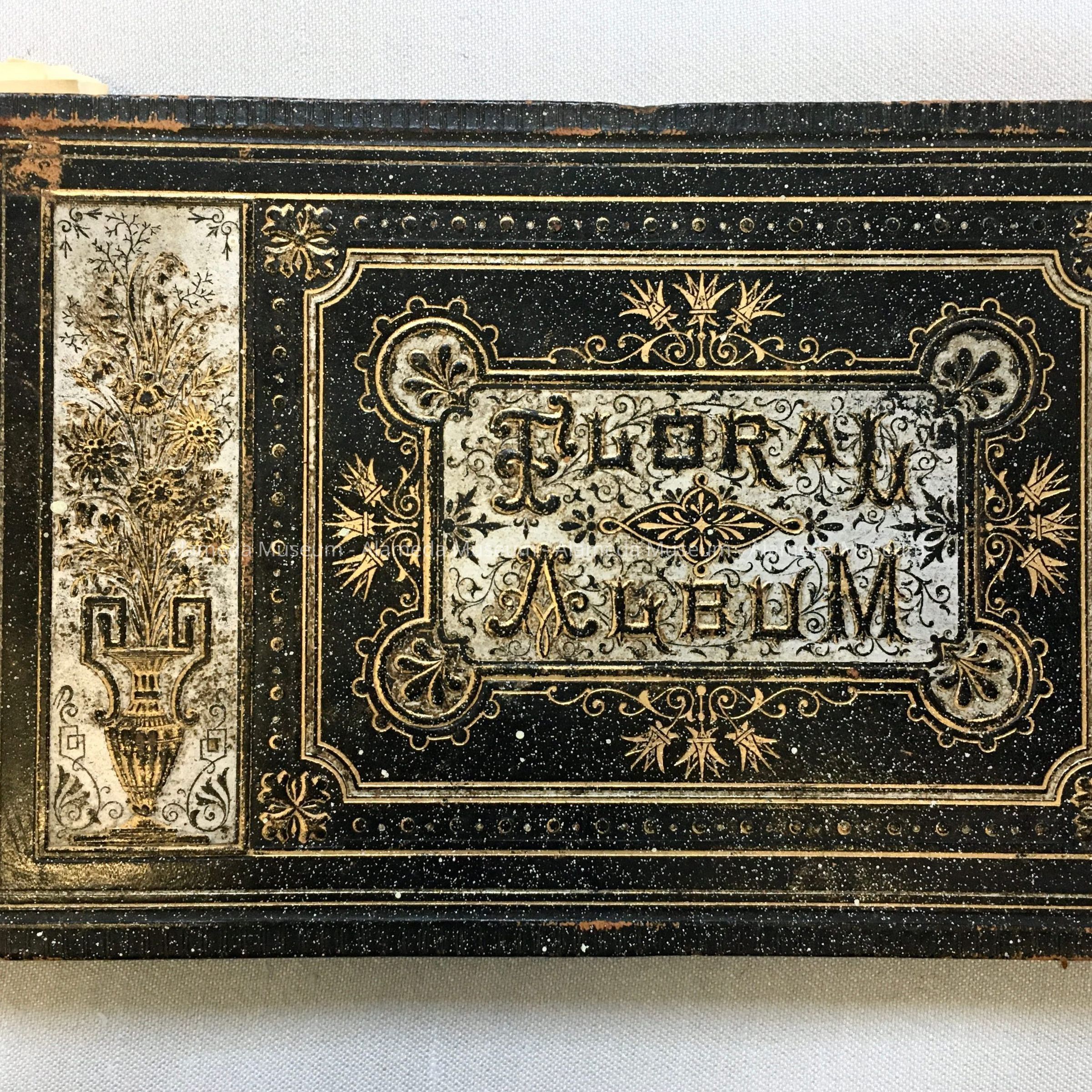 Description: Hard bound autograph album with embossed decorative cover in gold, silver and black. Heading stating floral album. Interior hand written autographs separated by colored lithographic plates.