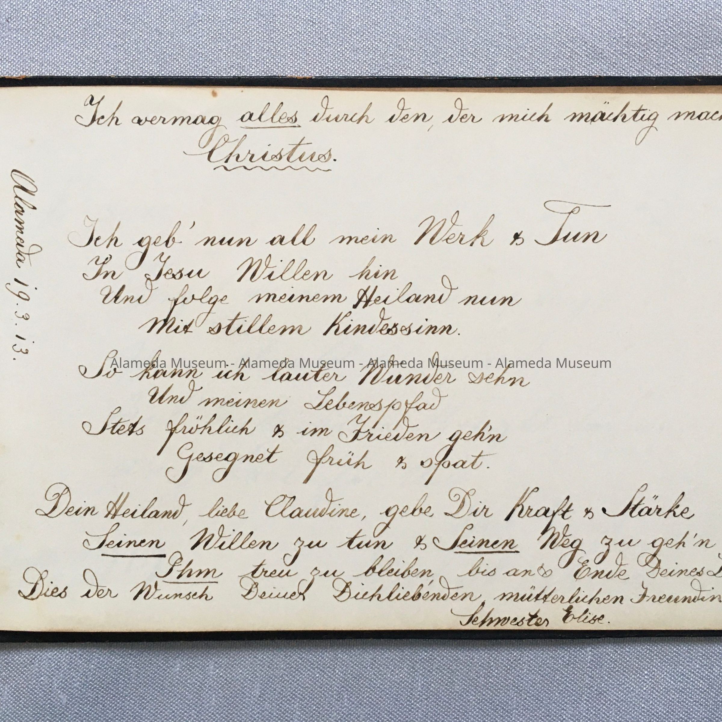 History of Object: Autograph album, C-1880's, of an Annie (last name unknown) who was German by descent. Many of the autographs are in German. Many of the names are members of the old German community of Alameda.