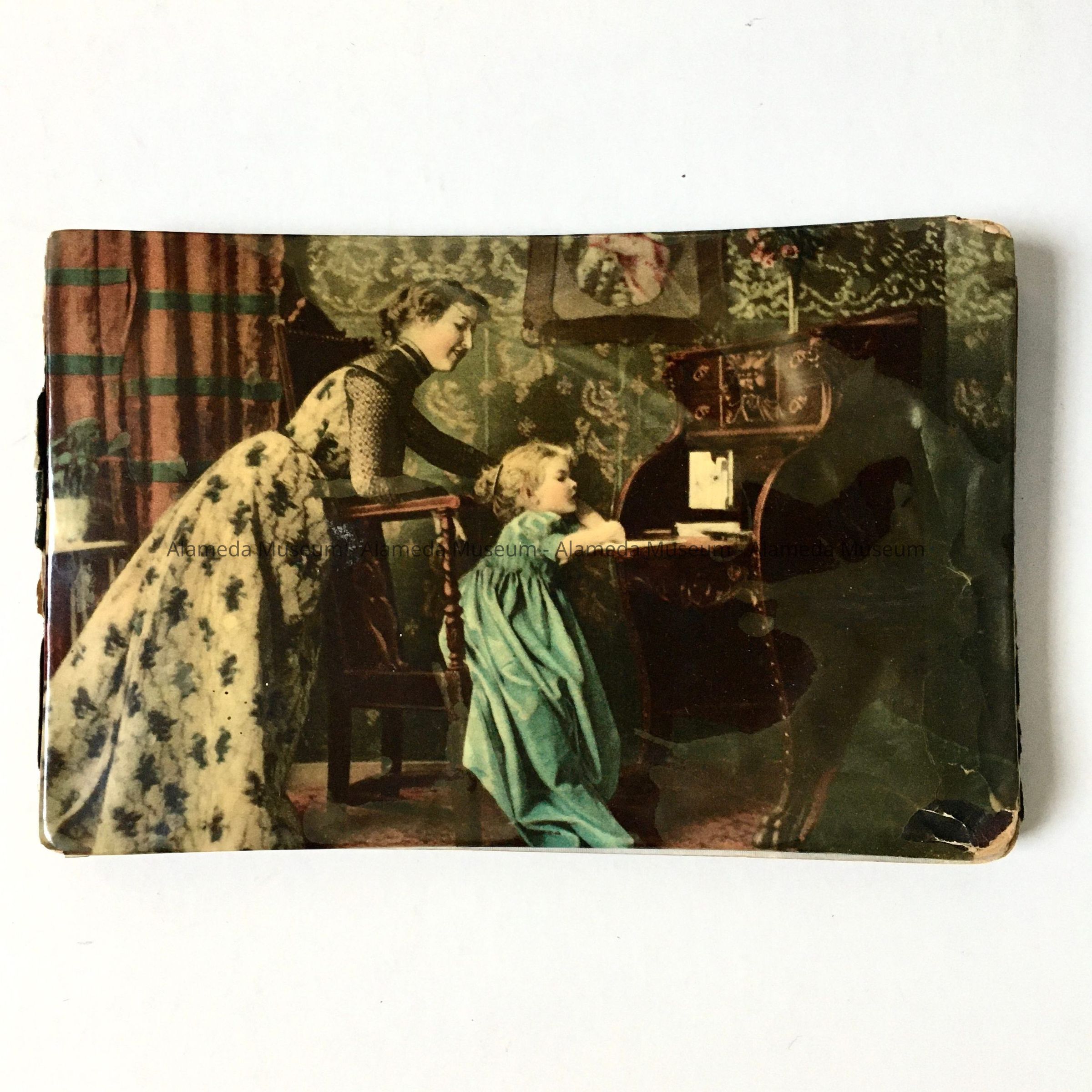 Description: Autograph album with decorative photo-lithographic cover (celluloid covered) depicting a little girl, accompanied by her mother, at a writing desk. Interior; autographs & embossed cut-outs (flowers, etc.).