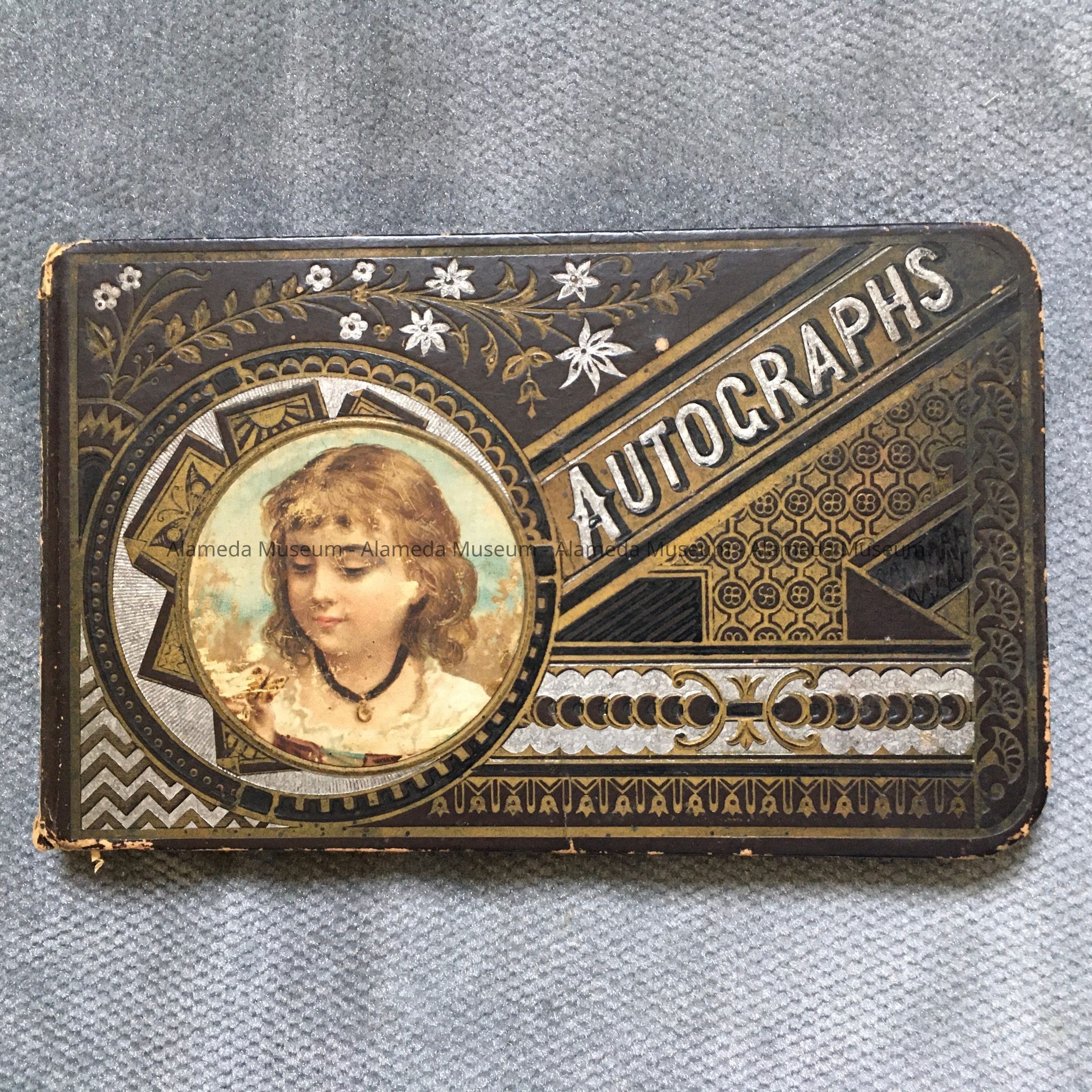 Description: Hard bound autograph album with decorative cover (embossed Victorian style designs of black, gold, & silver) with bold caption "Autographs” & illustration of girl (colored Lithograph).