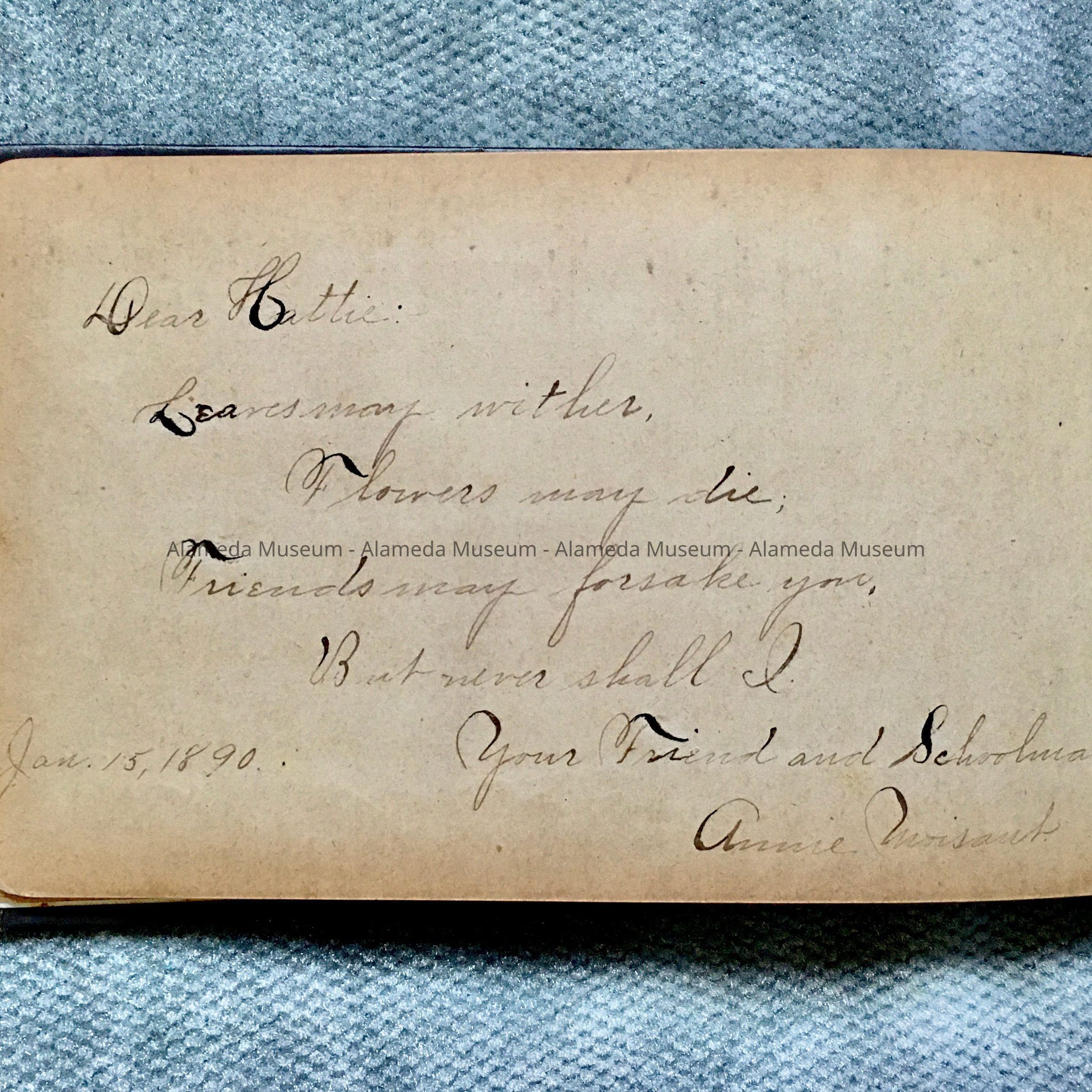 Autograph album belonging to Harriet (Hattie) McDonell, member of a pioneer Bay Farm Island family. It is signed by girlhood friends of Miss. McDonell. Noticeable are the names of prominent Bay Farm Island residents of the period.