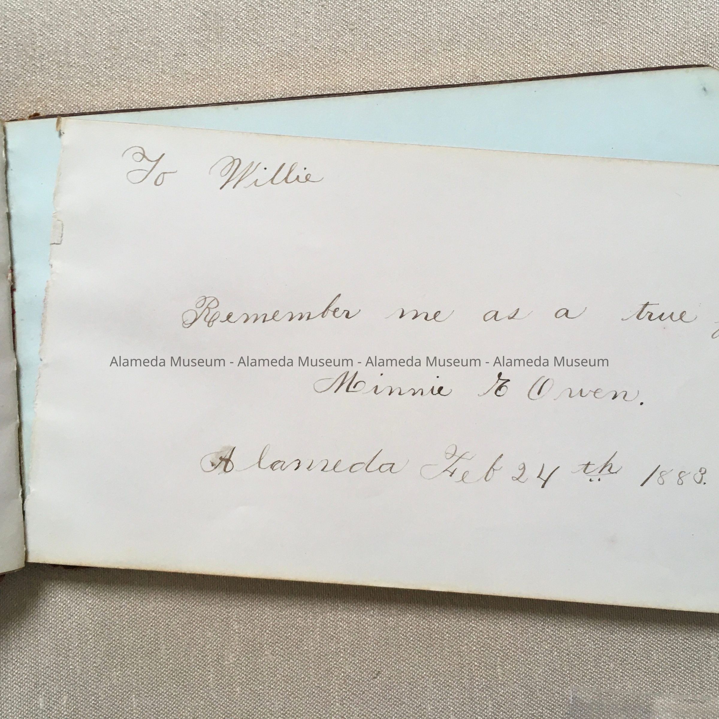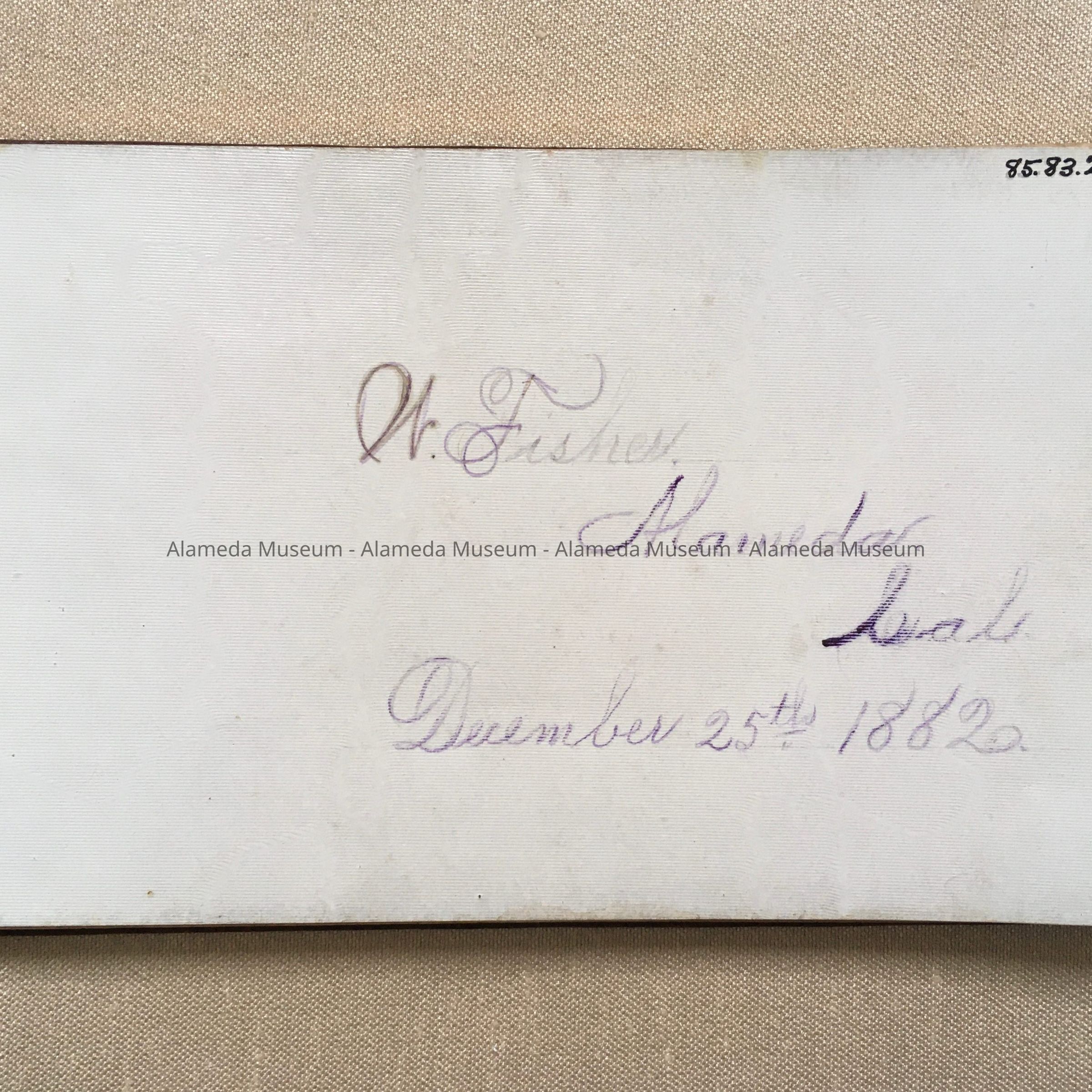History of Object: Autograph album of Willard J. Fisher of Alameda, dated Dec. 25, 1882. The album contains the signatures of several early Alameda residents.