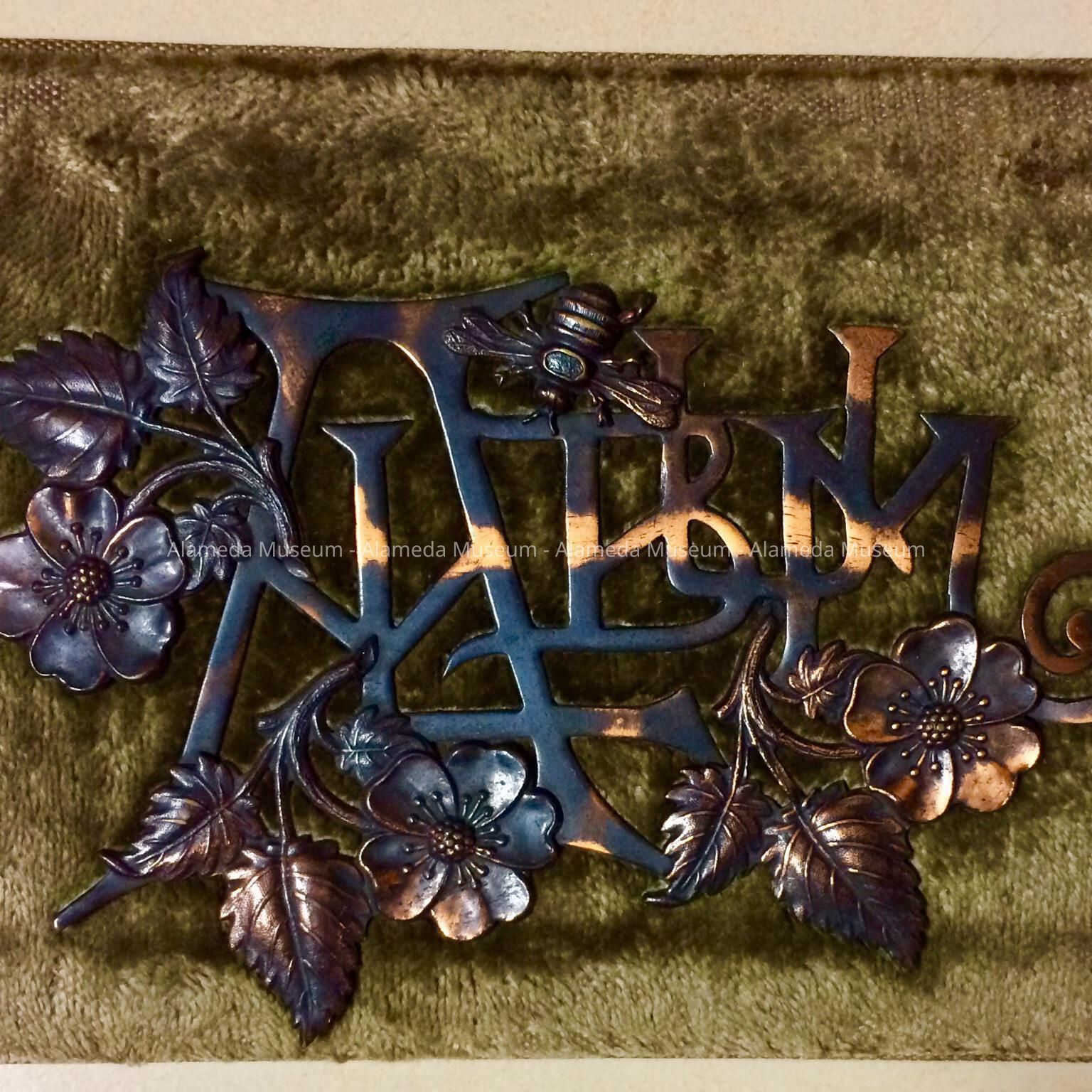 Description: Pale green plush covered album. On cover is stamped metal design in oxidized copper saying "ALBUM" entwined in flowers. Size: The album measures seven inches by four and a quarter inches.