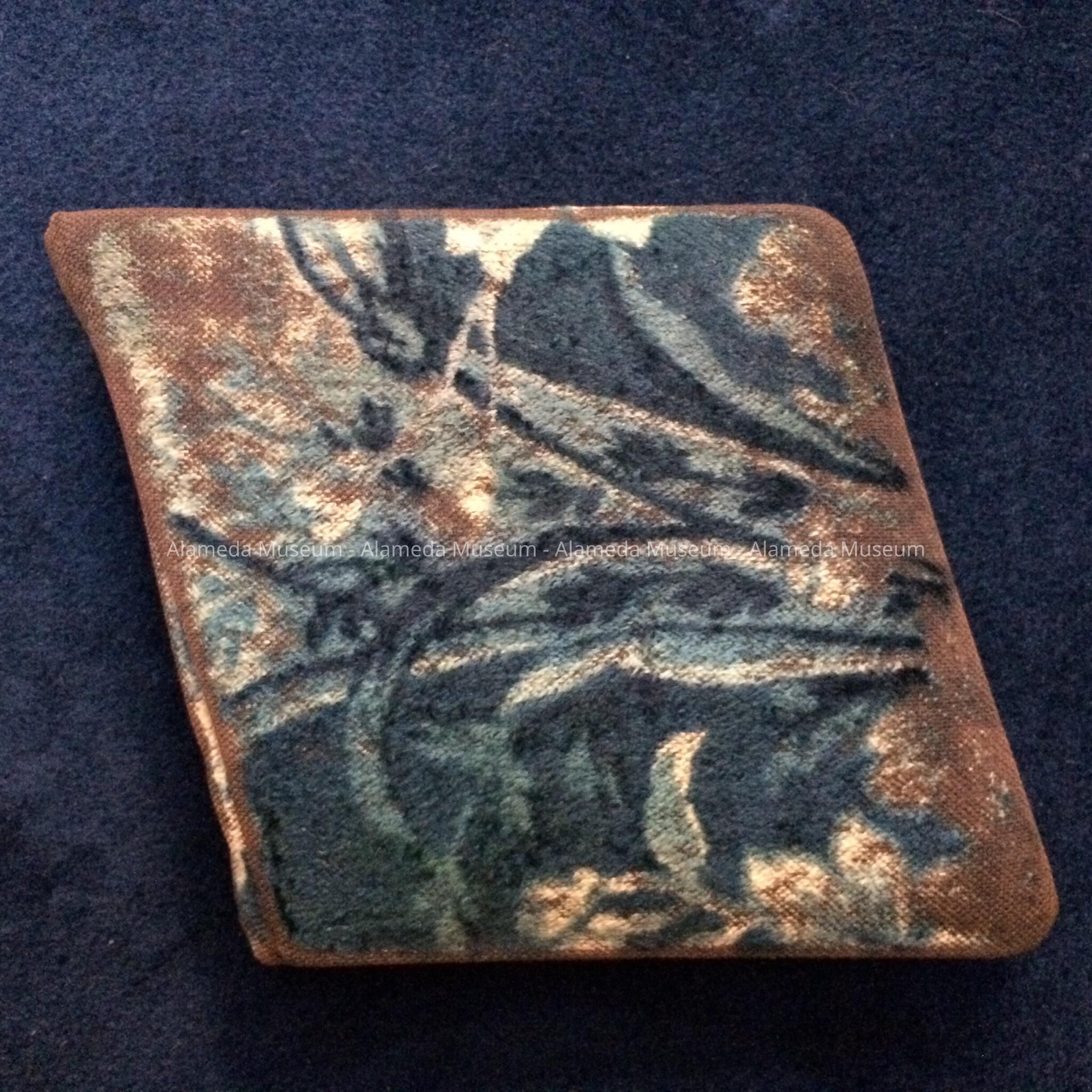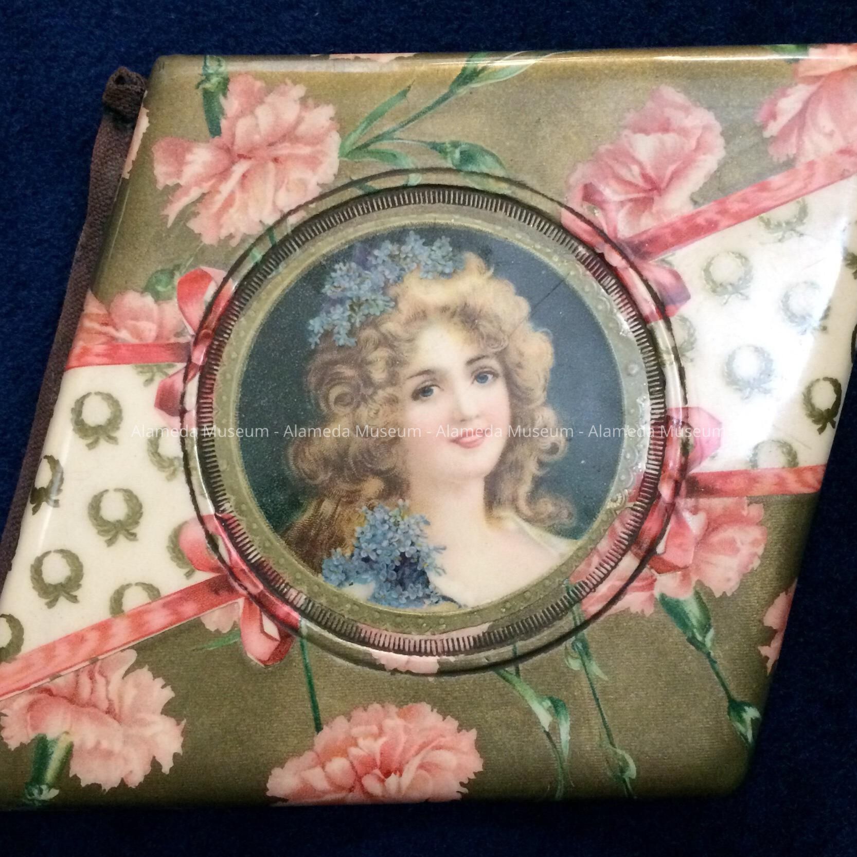 Description: Unusual shaped autograph album with celluloid cover (lithograph portrait of girl) and plush. Autographs hand written and dated.