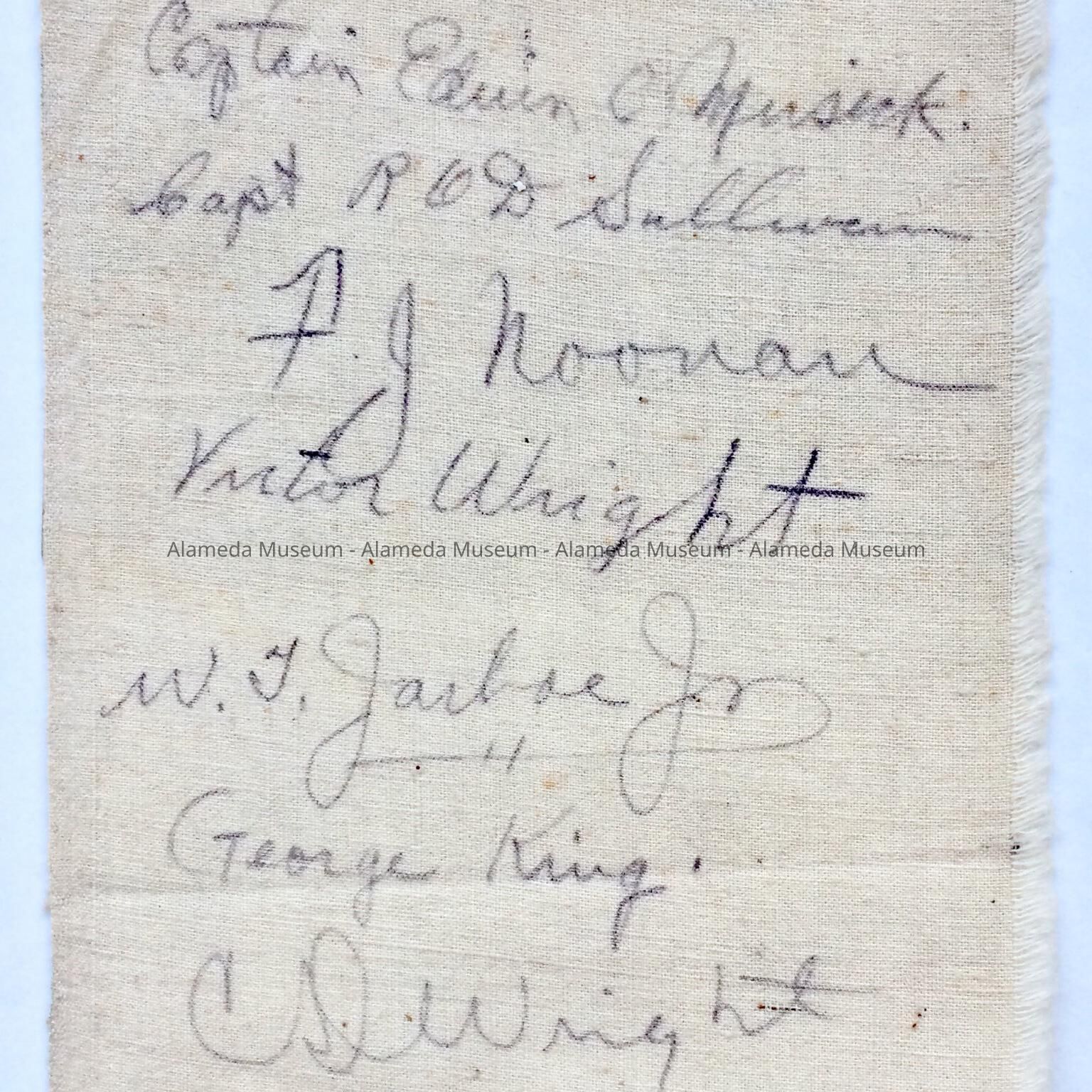 HISTORY OF OBJECT: THIS LINEN SQUARE CONTAINS THE AUTOGRAPHS OF THE PILOTS OF THE CHINA CLIPPERS, THE FIRST FLIGHT FROM ALAMEDA IN 1935. IT WAS ONCE THE PROPERTY OF THE DONORS MOTHER, MRS. ALICE K. NOYES, A EMPLOYEE OF THE ALAMEDA POST OFFICE DURING THE FLIGHT.