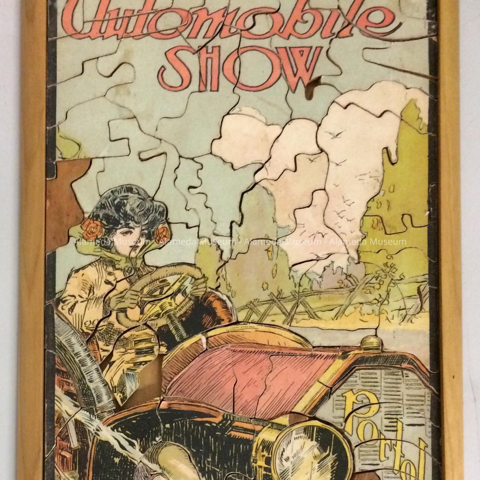 Description: Colored lithograph applied to wood (puzzle) with bold heading "Automobile Show." The subject of the puzzle depicts a girl in a duster driving an old time automobile. The lithograph is signed Marion De Lappe, 1909.