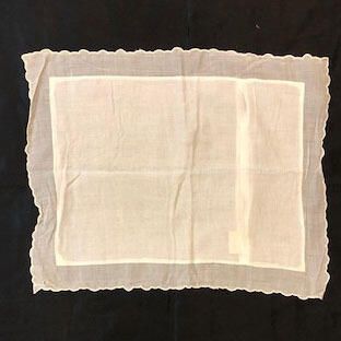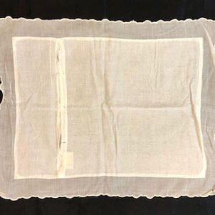 Pillow case of white colored lawn or voile, has scalloped edging which is trimmed in machine embroidery. Has a panel on reverse side which forms a pocket secured with three mother of pearl buttons. On front of pillow is a decoration consisting of hand embroidery in a feather-stitched design.