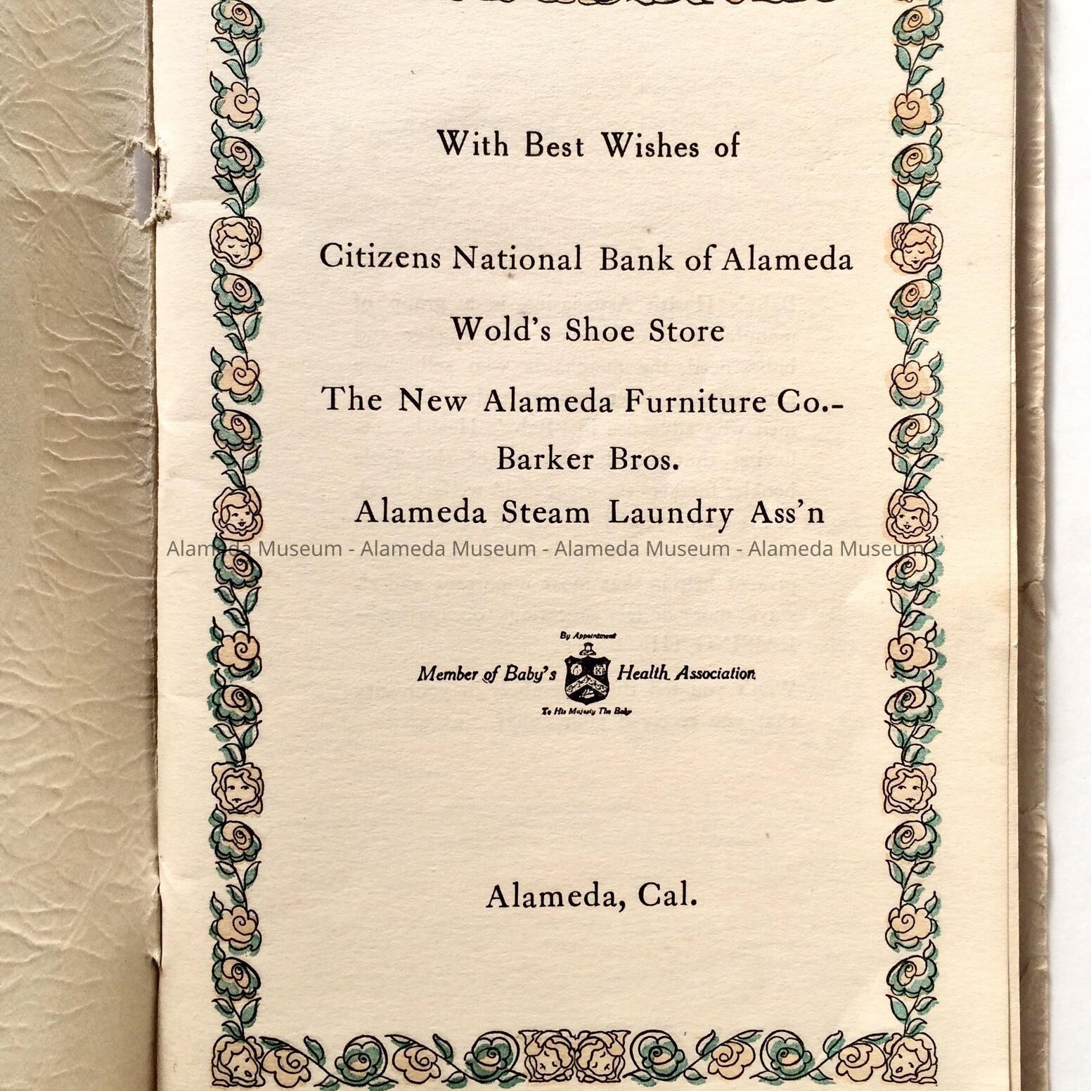 Booklet entitled, "Baby's Health and Record", published by the Merval Corp. It was sponsored by local businesses and has ads throughout the publication. Book includes information section with blanks filled out in hand. Information denotes birth of William Young, son of Emma E. Young, who was born at Tennant's Maternity Home, 1716 Chestnut Street, 11/22/1925. Physician, W.O. Smith.