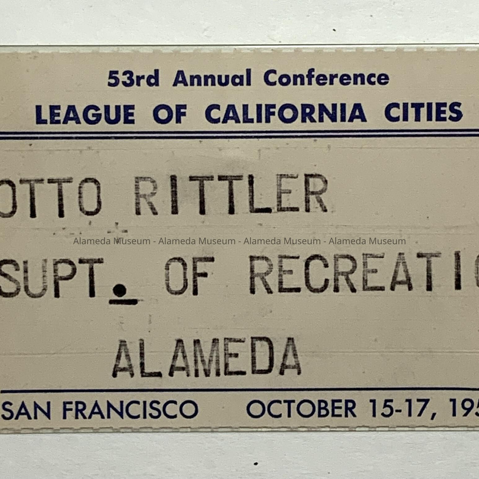 A BADGE WORN BY OTTO RITTLER, SUPERINTENDENT OF RECREATION, CITY OF ALAMEDA, TO THE 53rd ANNUAL CONFERENCE, LEAGUE OF CALIFORNIA CITIES, SAN FRANCISCO, OCTOBER 13-17, 1951.