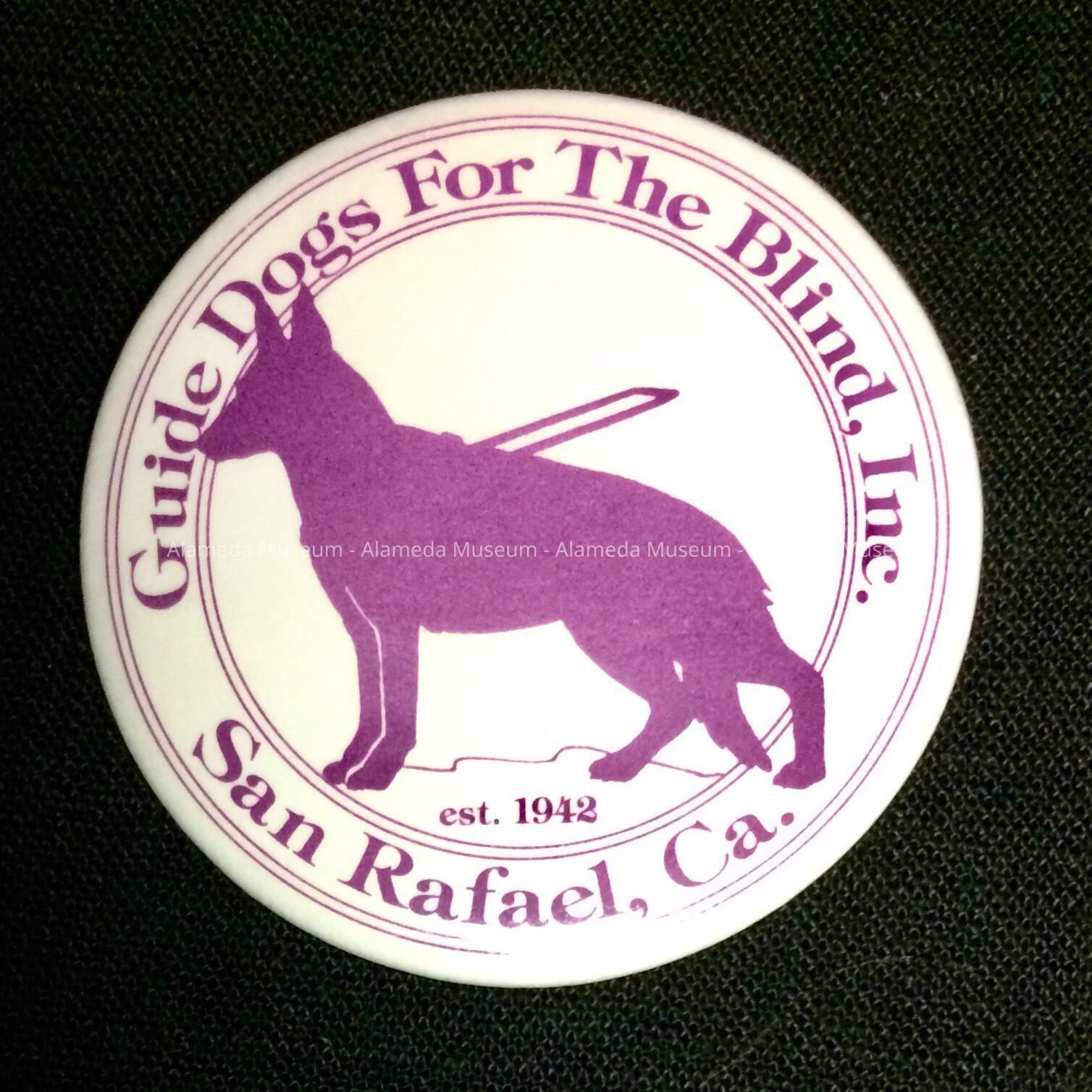 A CIRCULAR-SHAPED METAL BADGE, WITH ATTACHED FASTENER PIN. BADGE IS ILLUSTRATED WITH A GUIDE DOG AND THE CAPTION, "GUIDE DOGS FOR THE BLIND, INC., SAN RAFAEL, CA."