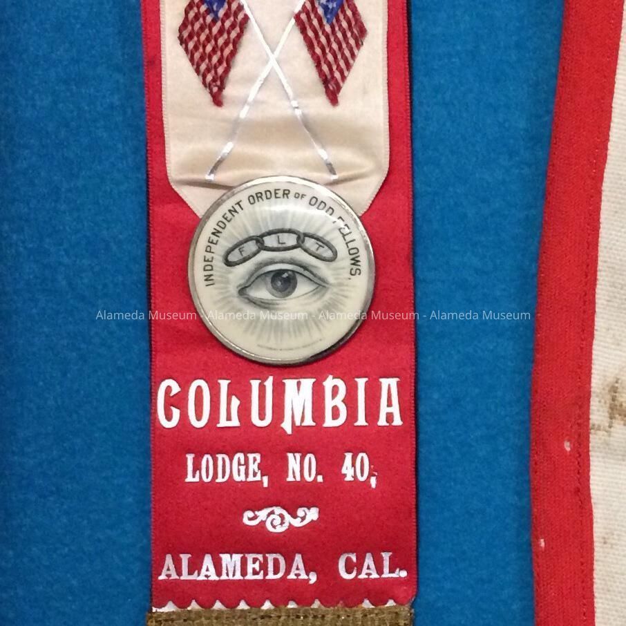Description: It is a satin badge, constructed of three different colors of satin, black, red, and white. It has fringe of gold brass. The ribbons are suspended by a brass pin, with a celluloid face, with motif of hands casp in friendship. There is a white satin pendant with two American flags, supporting a celluloid disk, which says "Independent Order of Odd Fellows"...stamped on the satin in silver: Columbia Lodge No. 40 Alameda, California".