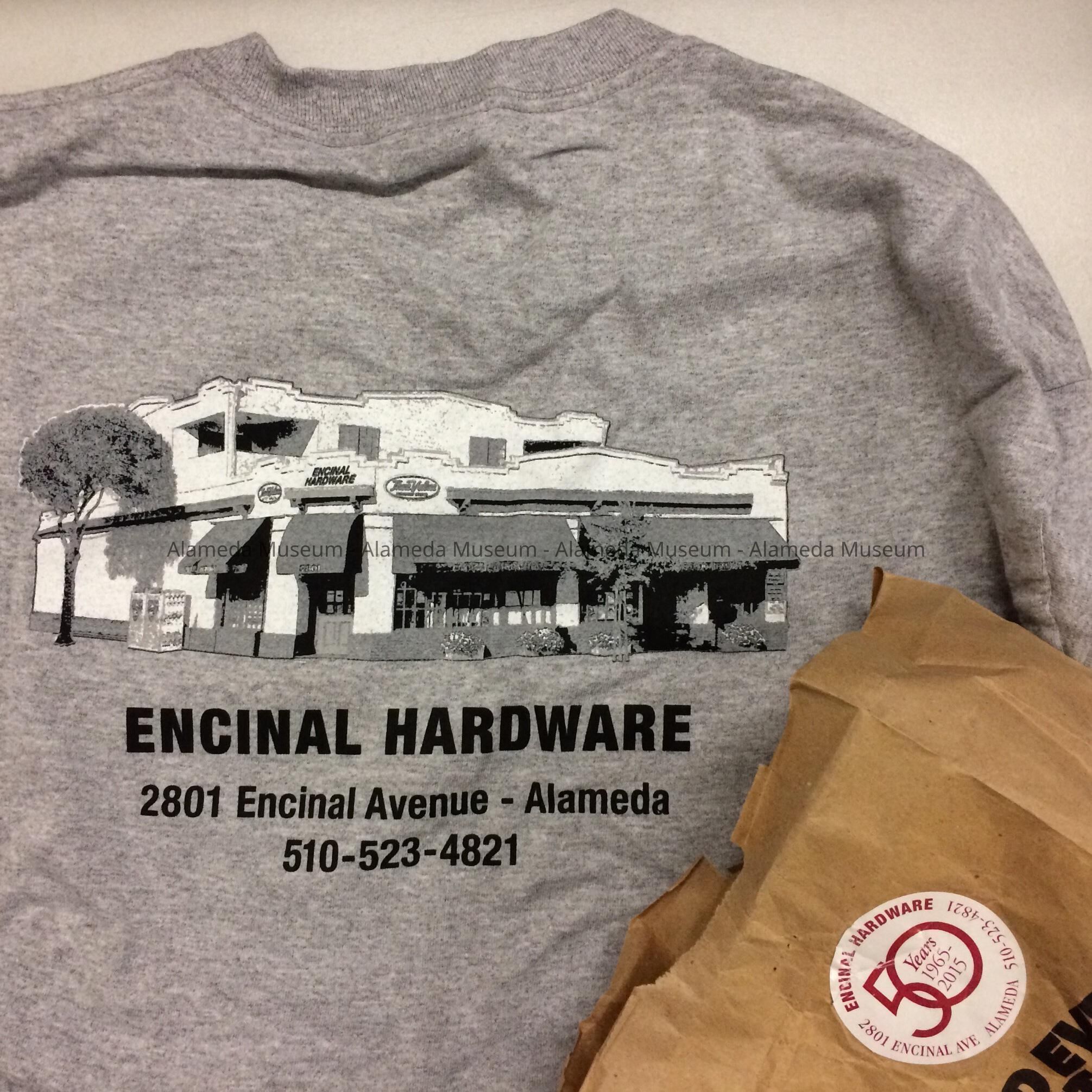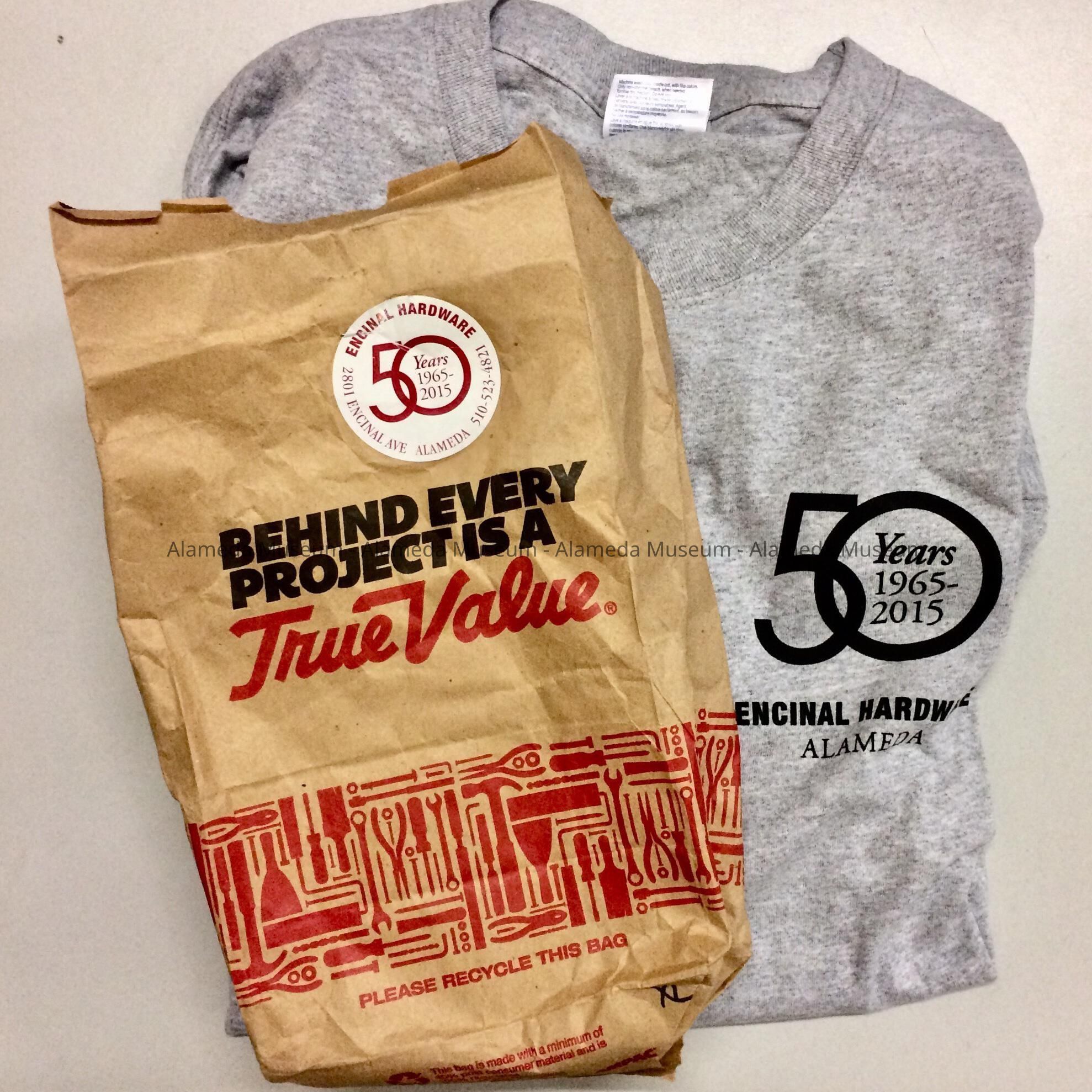 History of Object: t-shirt and bag with sticker celebrating the 50 years existence of the Encinal Hardware Store, in 2015.