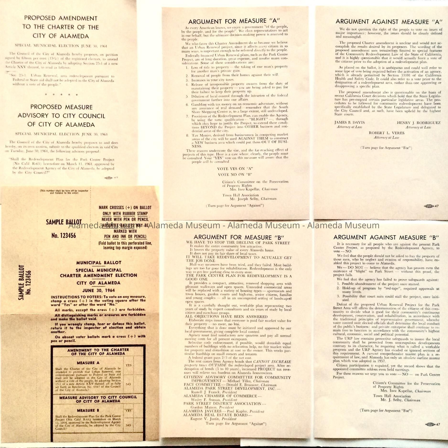 History of Object: Ballot and voter information handout concerning propositions A and B, the most important being an argument for/against the redevelopment of Park Street. Item A was sent to Helga Fenn and item B was sent to Chester Fenn, both residents of 2038 Alameda Avenue.