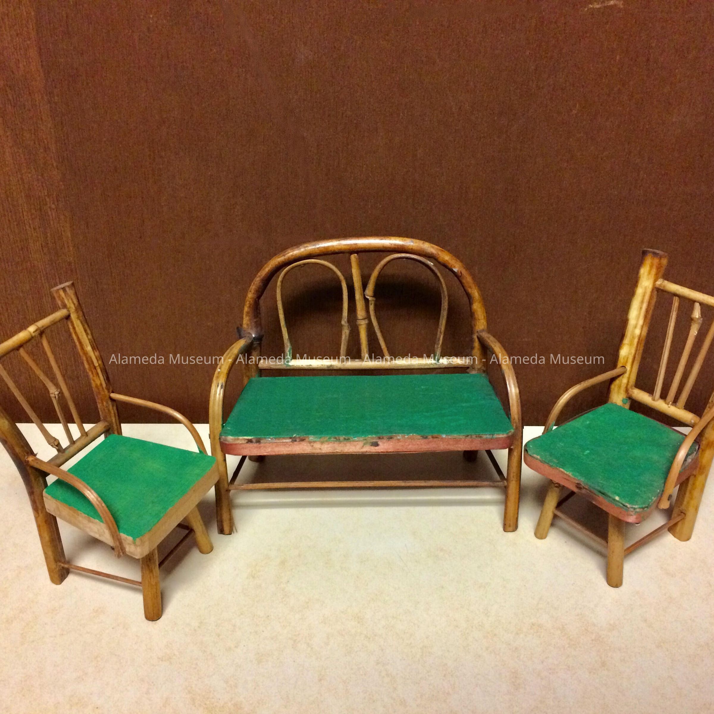 Description: Doll house furniture consisting of a three piece parlor set (settee & 2 arm chairs) made from bamboo with green painted seats. Appears to be of an Oriental manufacture.