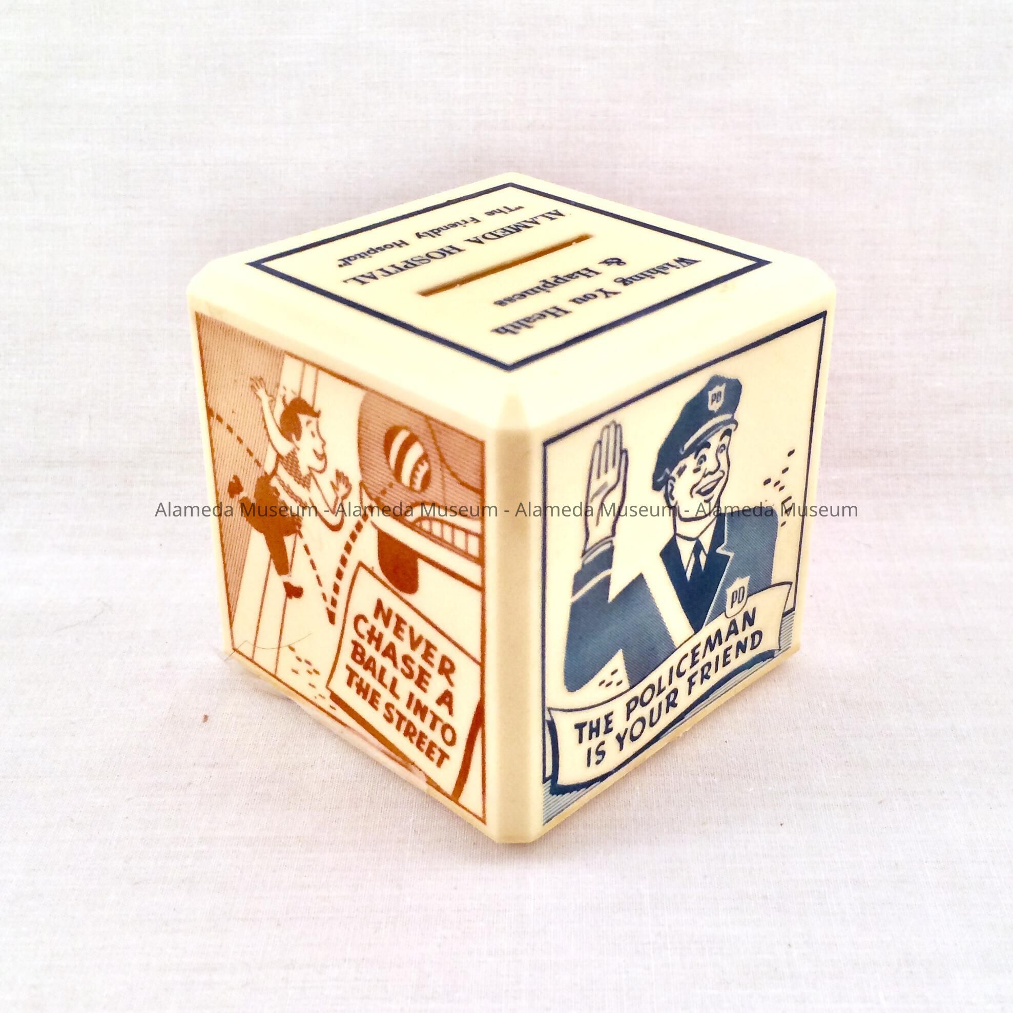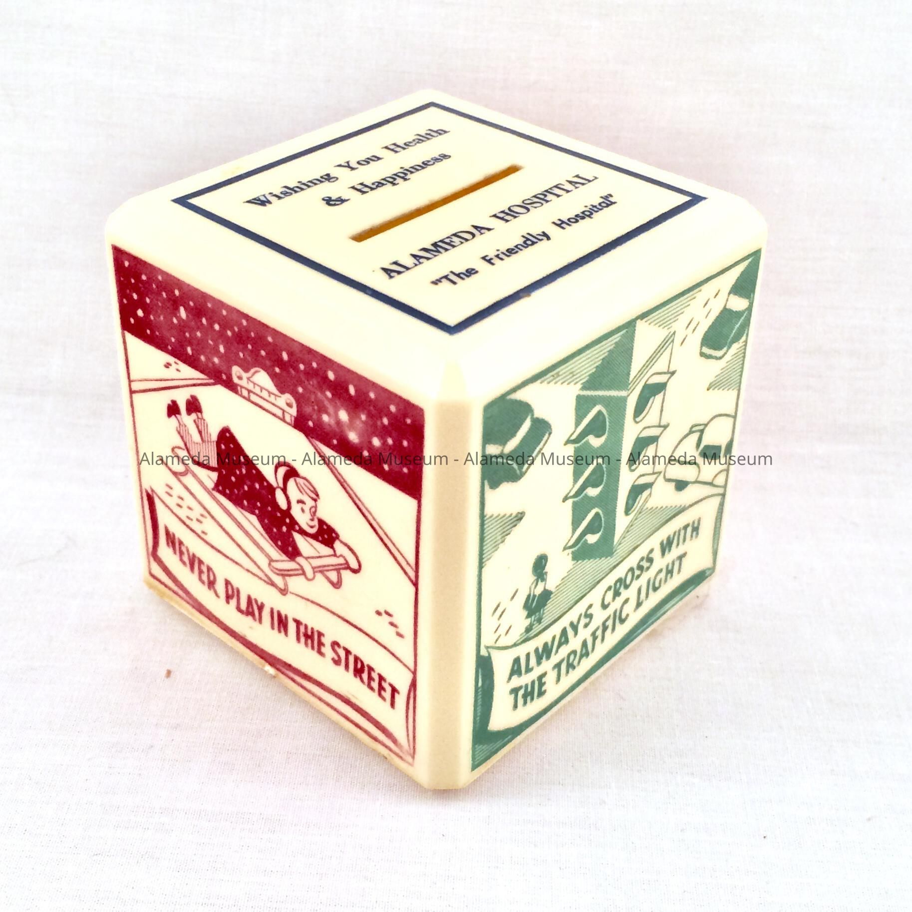 HISTORY OF OBJECT: A BANK ISSUED TO CHILDREN BY THE ALAMEDA HOSPITAL. THE BANK ALSO ILLUSTRATES CHILDREN'S SAFETY.