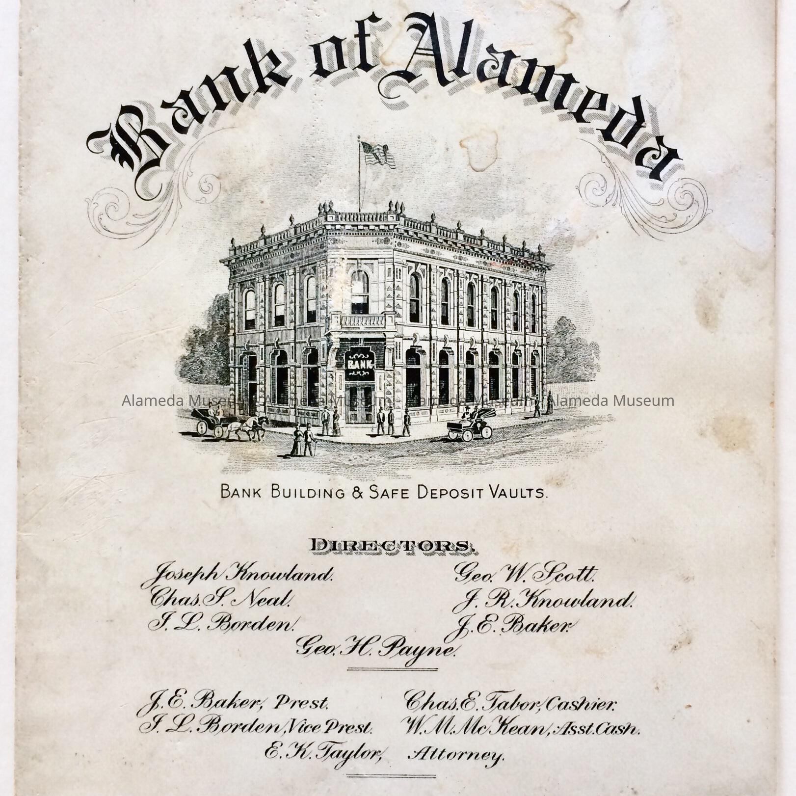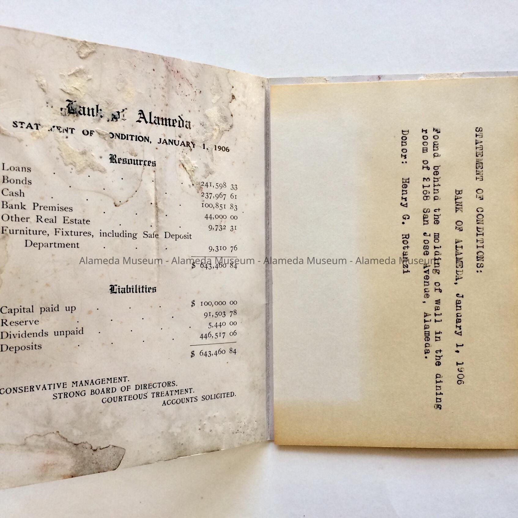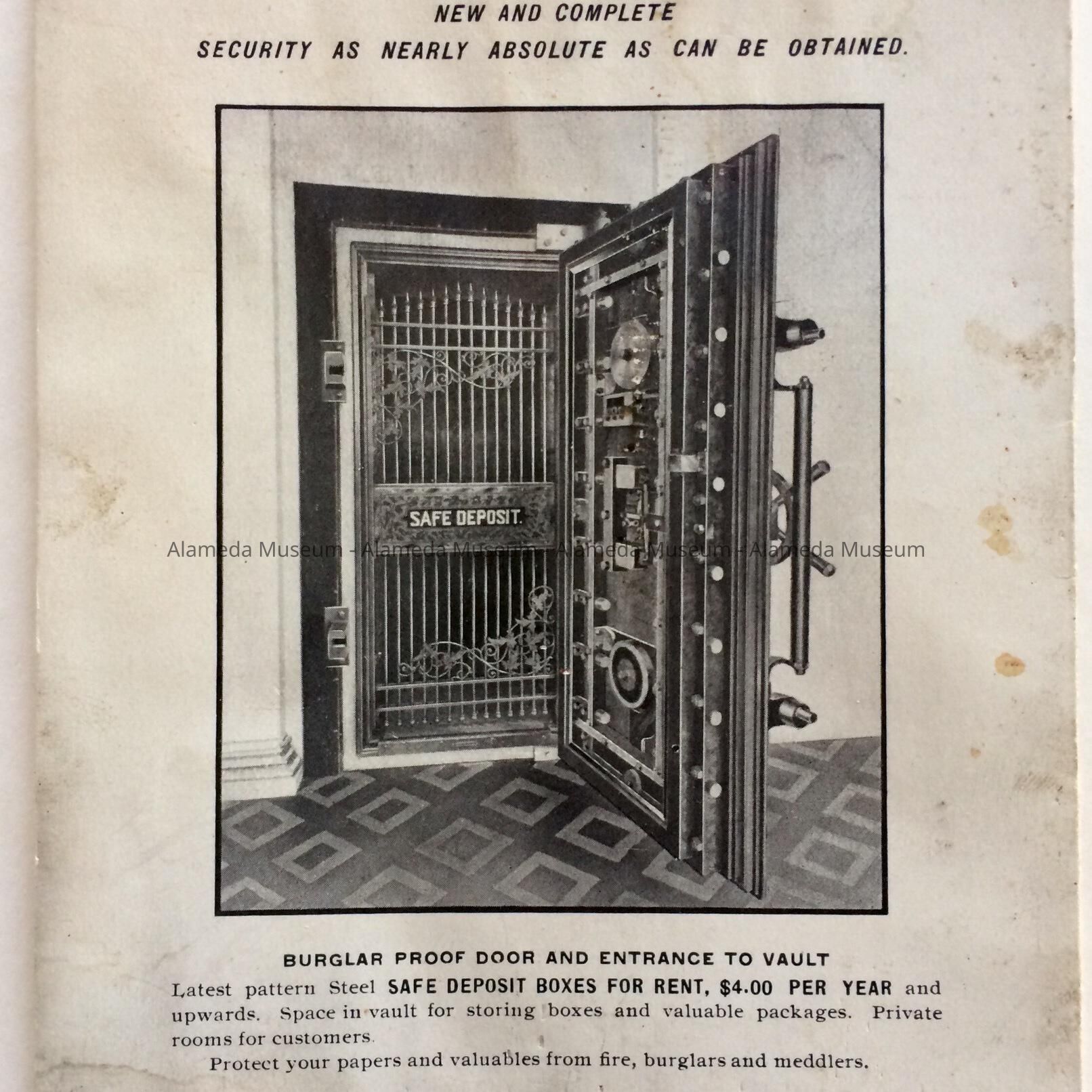 DESCRIPTION: TWO PAGE PAMPHLET, WITH ILLUSTRATION ON COVER OF THE BANK OF ALAMEDA, AND A LIST OF DIRECTORS AND EMPLOYEES. ON THE BACK COVER IS A PHOTOGRAPH OF THE SAFE DEPOSIT VAULT. THE PAMPHLET CONTAINS A STATEMENT OF CONDITIONS, FOR JANUARY 1, 1906.