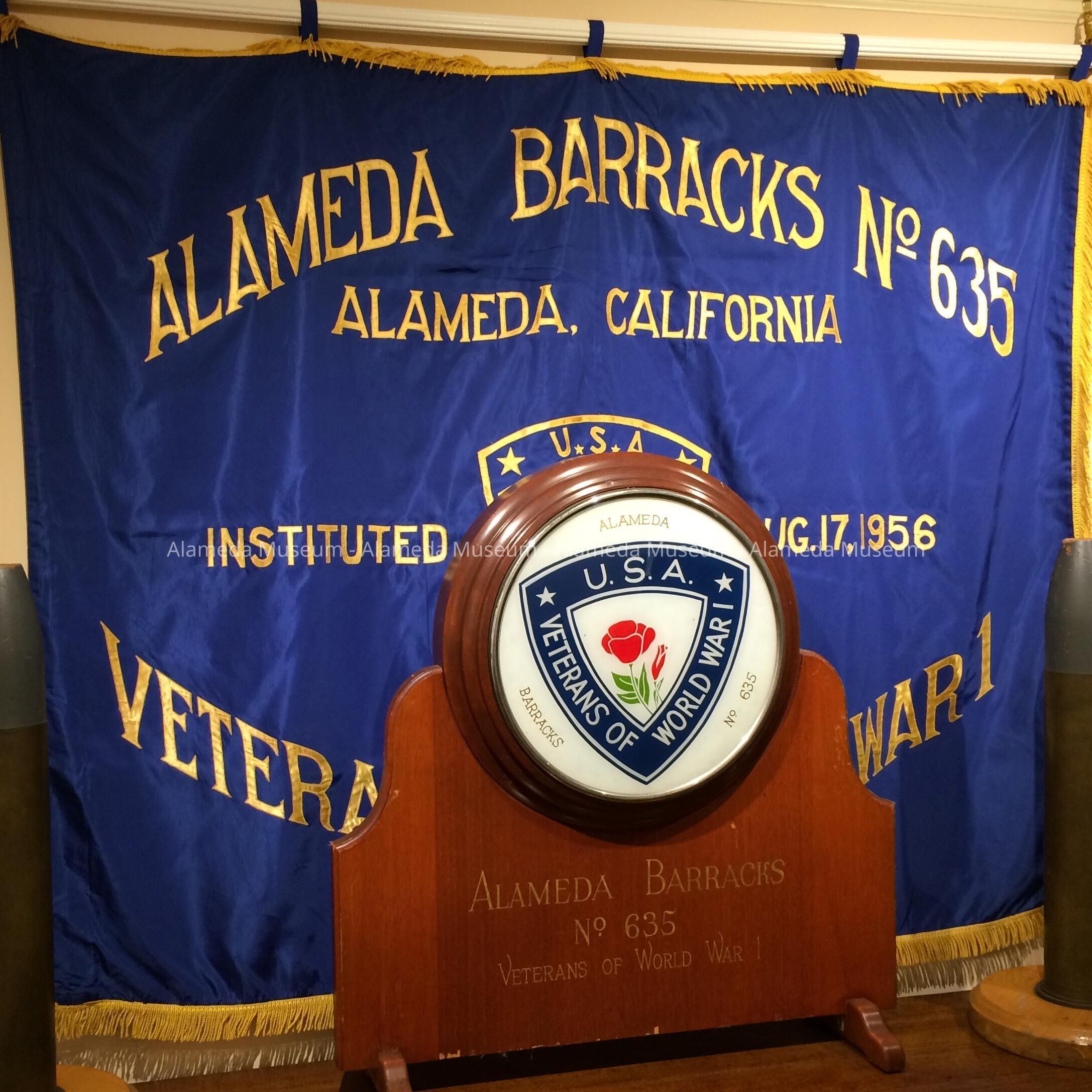 DESCRIPTION: Background is blue; has appliqued lettering stating "Alameda Barracks No. 635 Alameda, California Instituted August 17, 1956 Veterans of World War I of U.S.A.". Has a center motif of red, green and gold with the insignia of the Veterans of World War I. Has a 3" gold fringe completely around it and is doubled faced. Has same inscription on both sides.