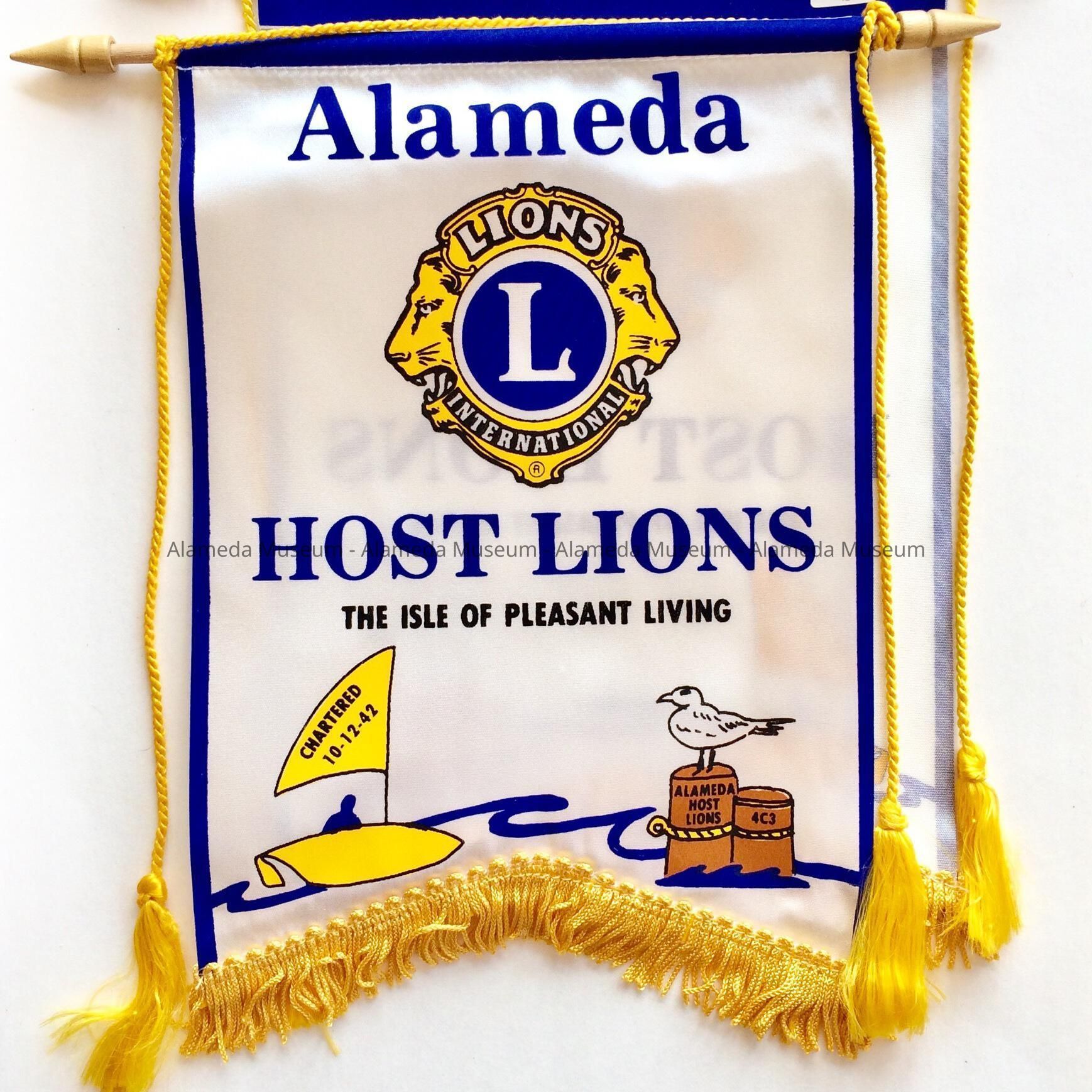 Description: Pair of rayon banners with orange-yellow, black and blue colored type on a white background, bold printed caption 'Alameda - Host Lions', subtitle 'The Isle of Pleasant Living', the emblem of the Lions International, the image of a sailboat with on the sail 'Chartered 10-12-42', and a seagull on two poles, stating 'Alameda Host Lions' and '4C3'. Edged in blue. Banners have a hanging rope with gold rayon tassels and fringe.