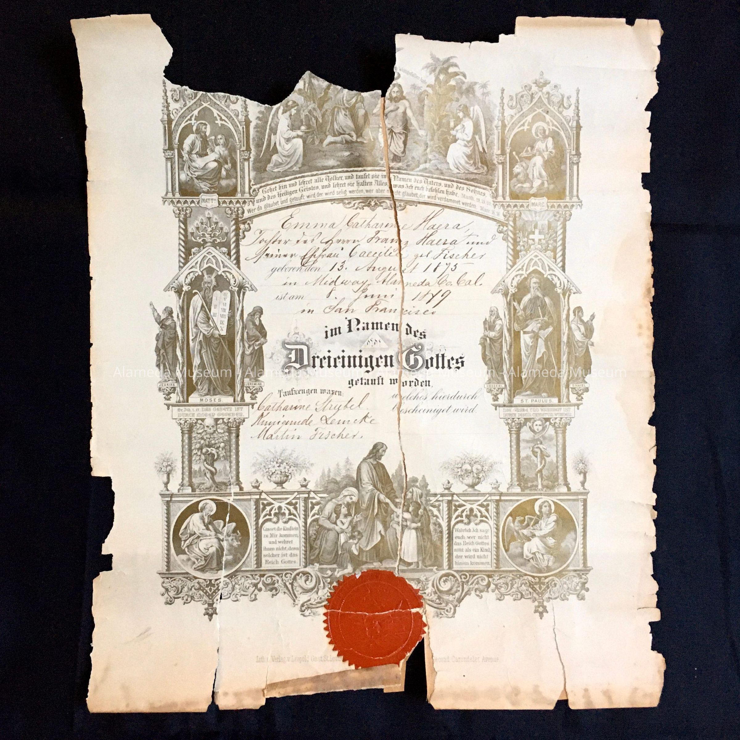 Baptismal certificate of Emma Catharine Haera, born. August 13, 1875, and wife of Henry Brink. The Brinks, parents of the late Mabel B. Schumacher, were old-time residents of Alameda.