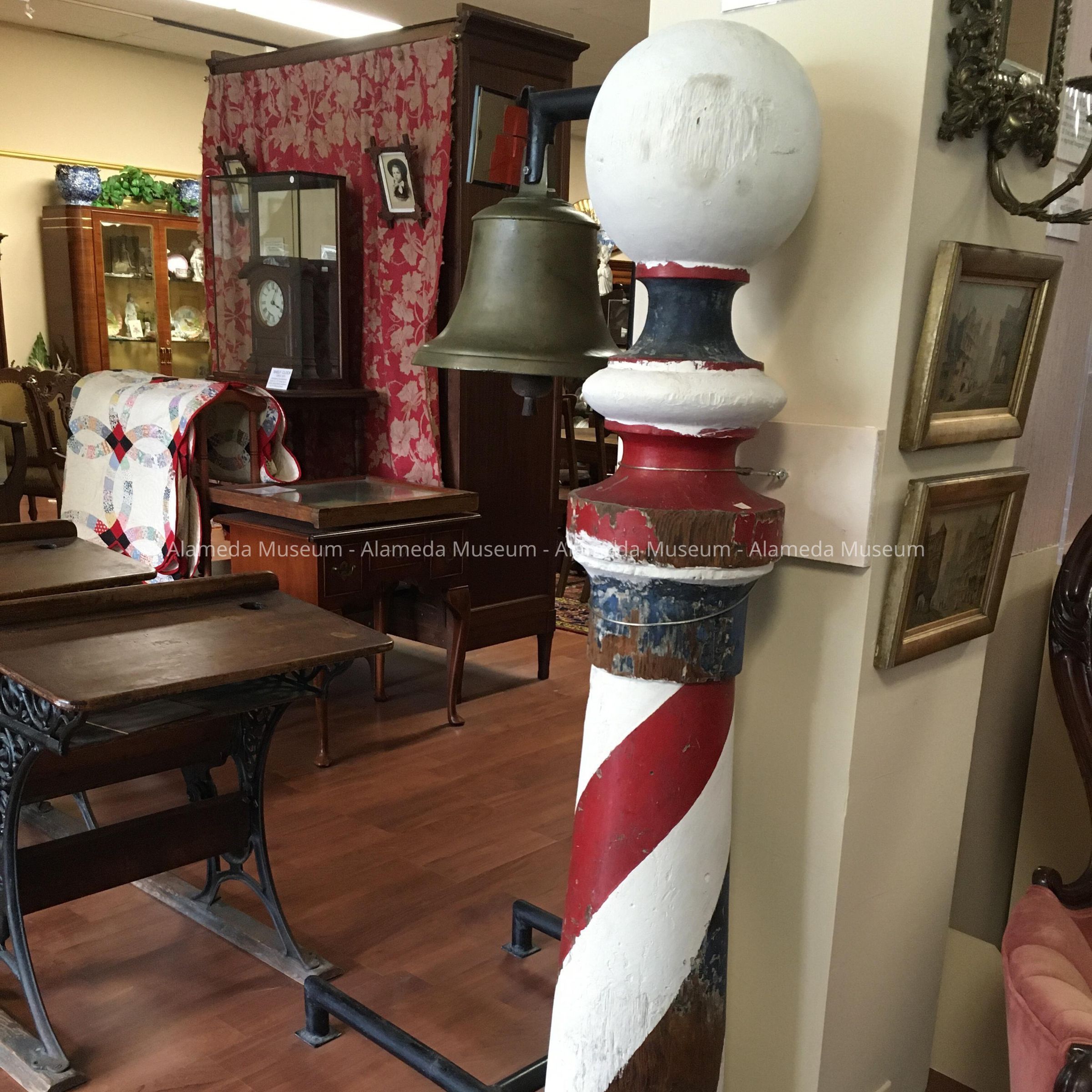 History of Object: This barber pole stood in front of the shop of Mr. Charles Sturms, 1547 Webster Street, for thirty-eight years. It was located next to Hickman's Grocery Store and there was a dance hall above. Mr. and Mrs. Sturms owned a boarding house on the corner of Haight Avenue and 8th Street. He was also one of the first volunteer fireman and was 75 years old when he died. The barber pole was then sold to Mr. Saul Dischel who owned it for fifty years. The pole dates back to about 1879. Formerly barbers practiced surgery and dentistry and were called barber surgeons.