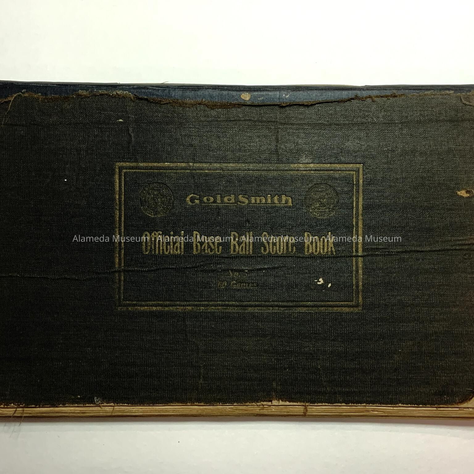 A SCORE BOOK, WITH COVER OF BLACK-COLORED BUCKRAM. COVER HAS THE CAPTION, "GOLDSMITH OFFICIAL BASEBALL SCORE BOOK," IN GOLD-COLORED TYPE. INTERIOR HAS PRINTED FORM SHEETS WITH INFORMATION BLANKS, ETC., AND HANDWRITTEN ENTRIES IN PENCIL.