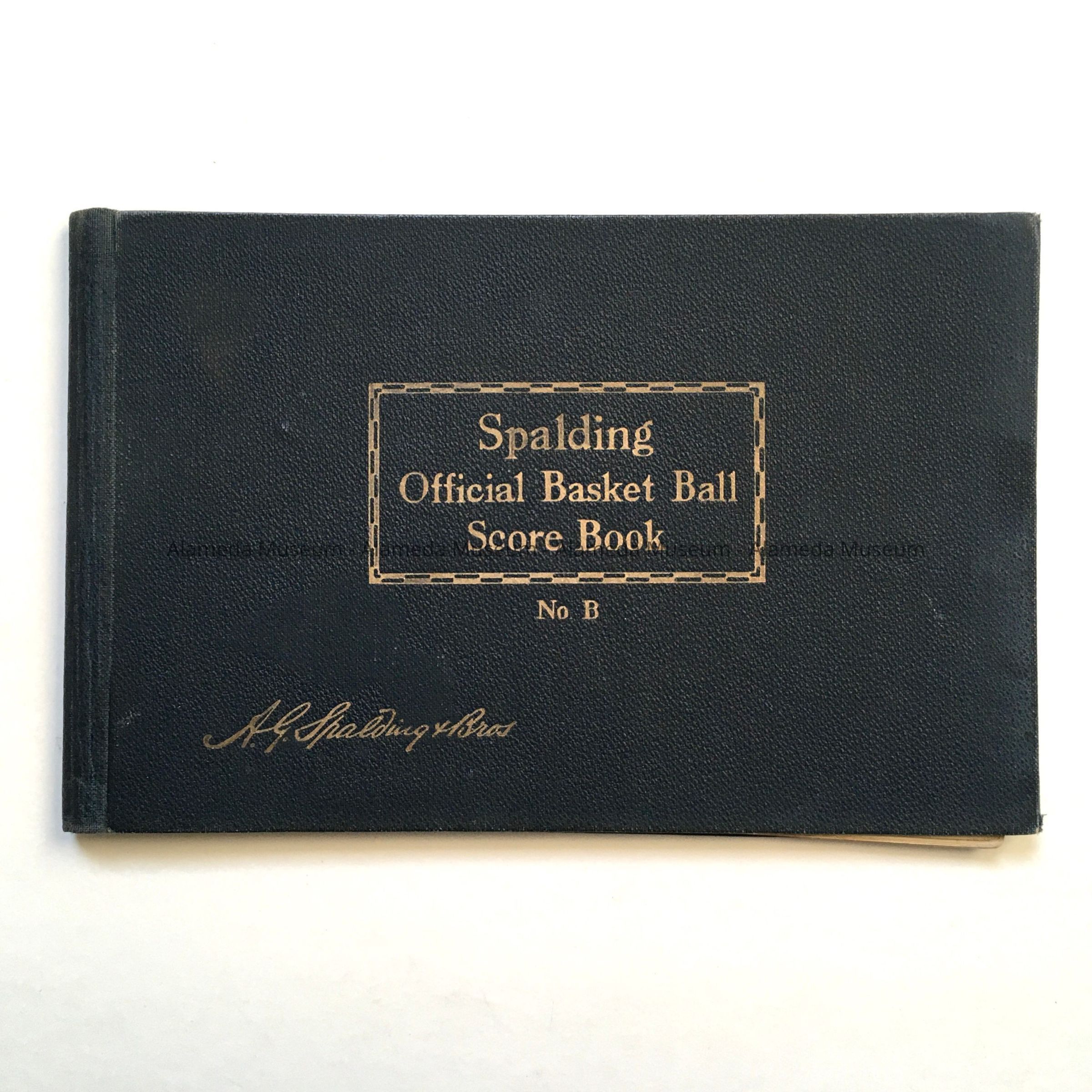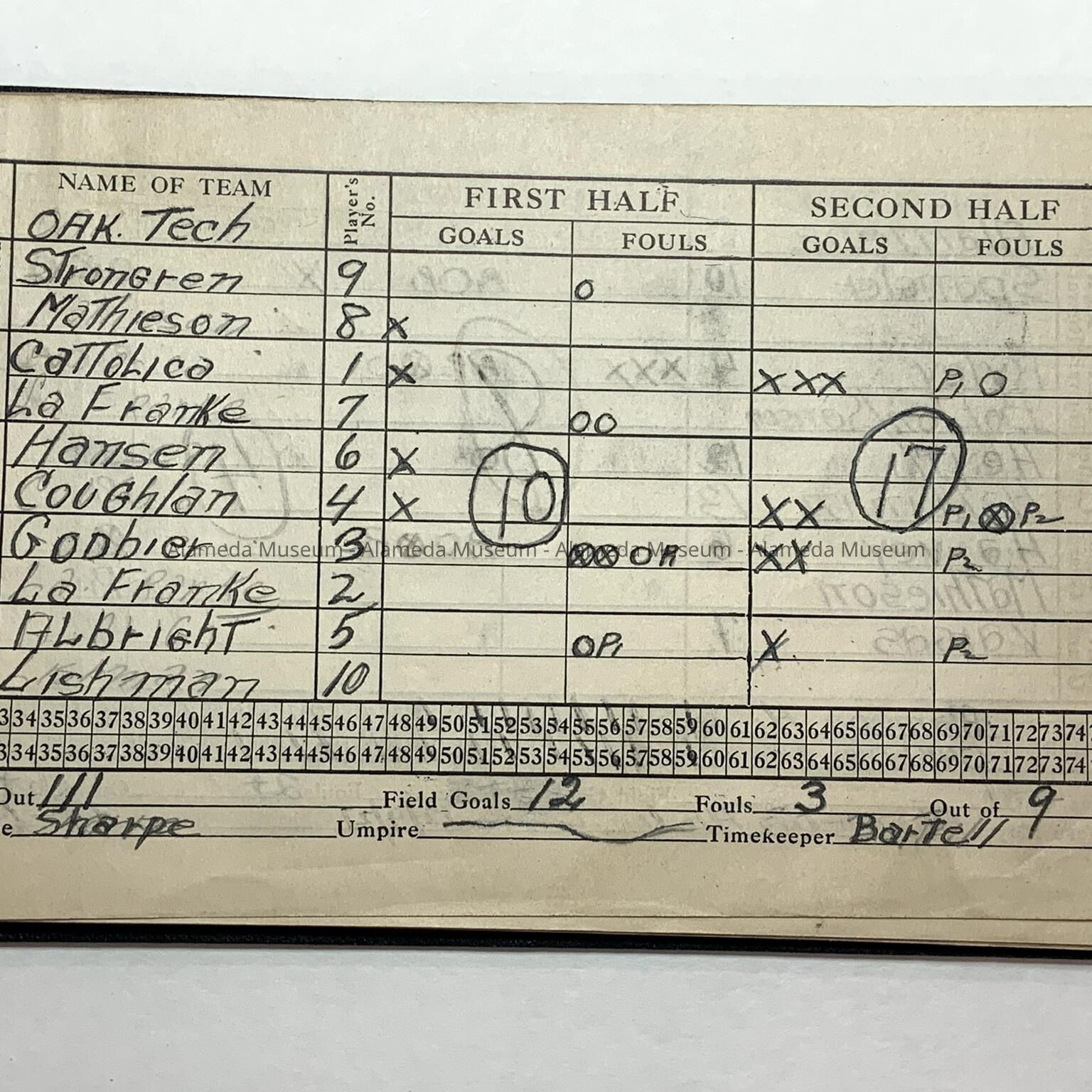 A BOOK, WITH PRINTED FORM SHEETS CONTAINING HANDWRITTEN ENTRIES IN COLORED INK, NOTING BASKETBALL SCORES OF ALAMEDA HIGH SCHOOL ATHLETES, PLAYERS' NAMES WERE ENTERED IN THE BOOK.