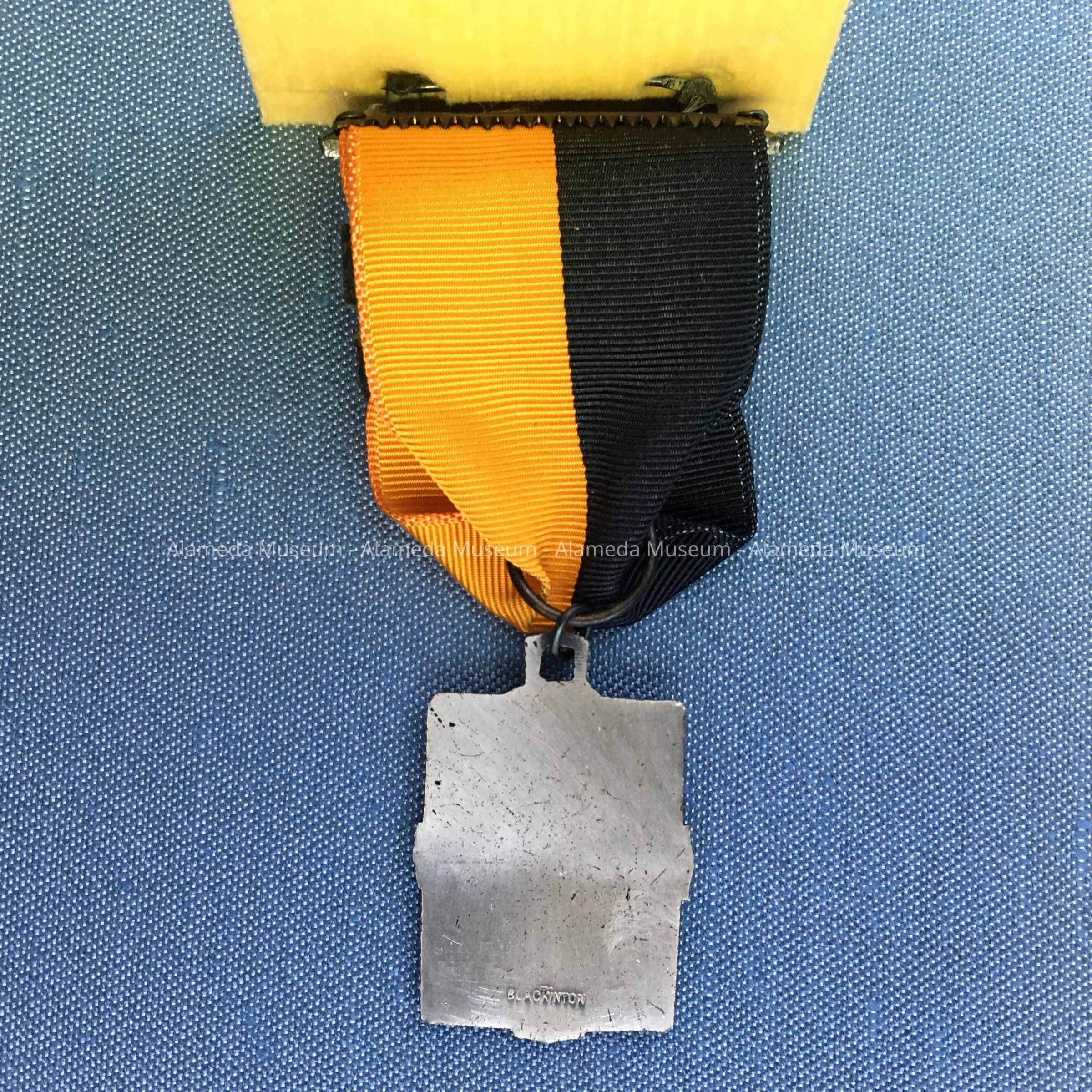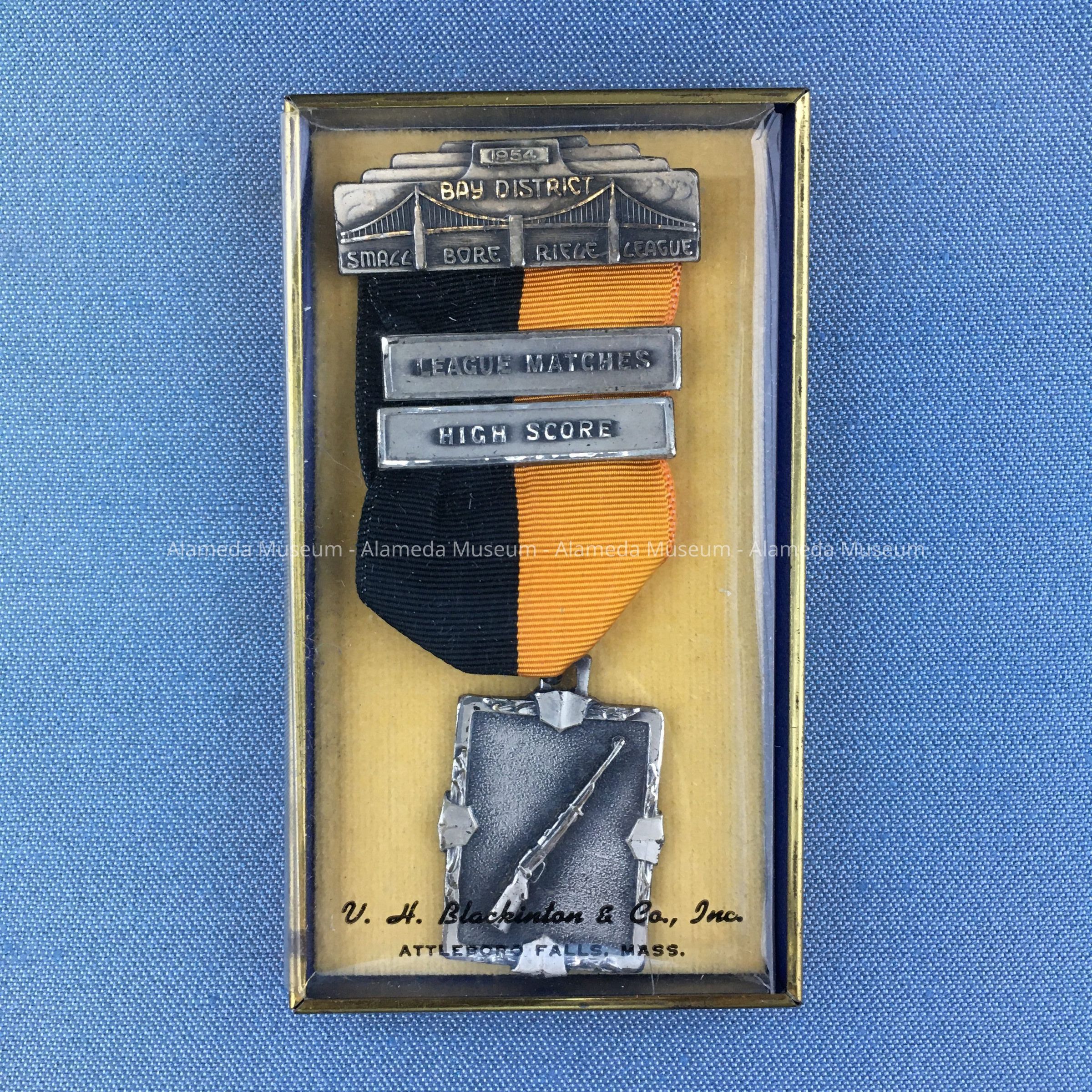DESCRIPTION: SILVER-PLATED MEDAL, WHICH IS SUSPENDED BY A BLACK- AND ORANGE COLORED GROSGRAIN RIBBON. MEDAL HAS BARS WITH AN EMBOSSED CAPTION, "LEAGUE MATCHES, HIGH SCORE." SUSPENDING BAR BEARS AN INSCRIPTION, "BAY DISTRICT SMALL BORE RIFLE LEAGUE." MEDAL IS CONTAINED IN ITS ORIGINAL BOX WITH PLASTIC SEE-THROUGH COVER. COVER HAS A CAPTION, "VH BLACKINGTON & CO., INC., ATTLEBORO FALLS, MASS." MEDAL IS ATTACHED TO A PALE YELLOW-COLORED VELVET BACKGROUND IN ITS ORIGINAL BOX.