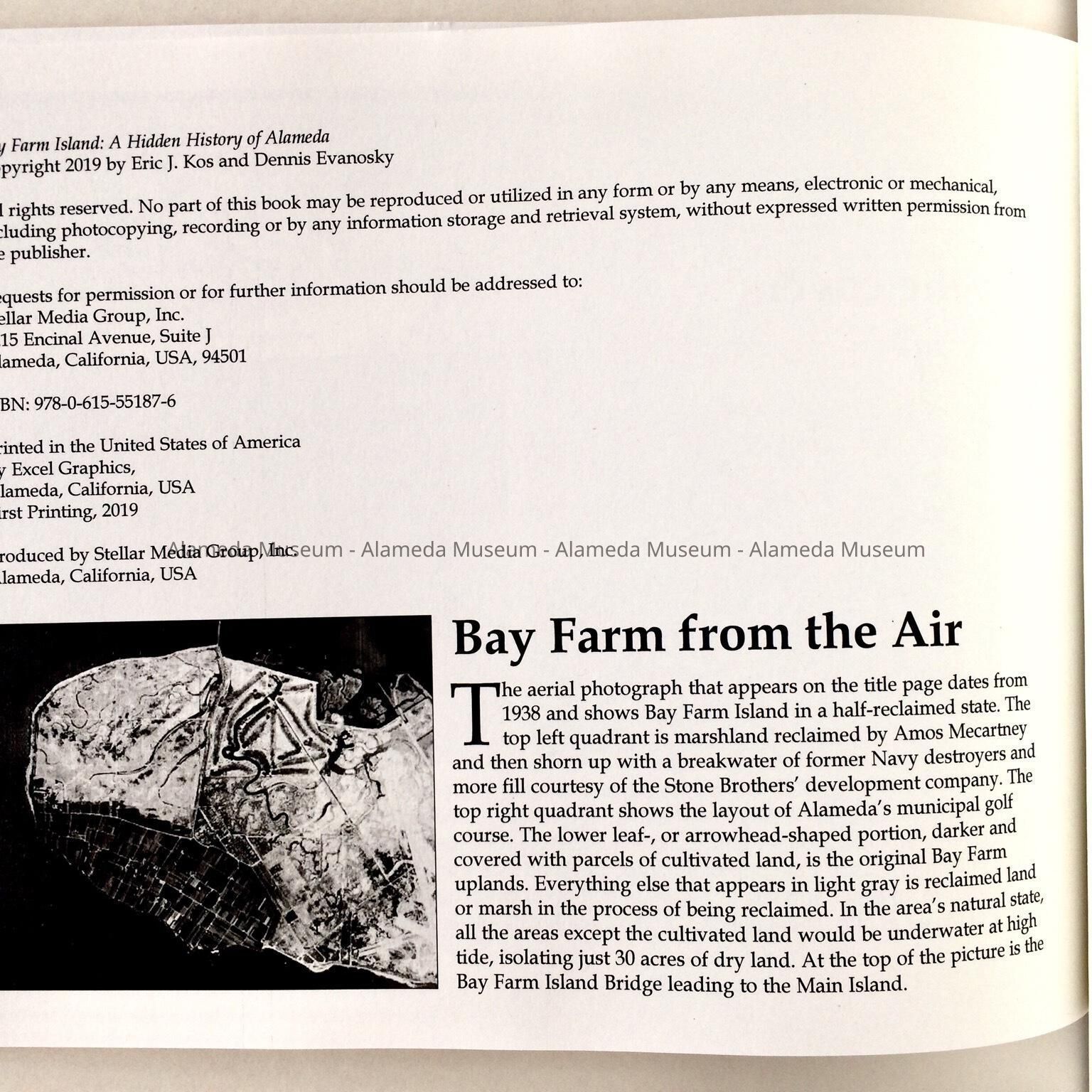History of Object: Book about Bay Farm Island, the 5th book written by Dennis Evanosky and varying partners. The book describes the development of Bay Farm Island from an island flanked by Marsh in Ohlone time, through the Spanish and Mexican period under the Peraltas, the founding of Alameda by Chipman and Aughinbaugh, and the development by Ron Cowan to a peninsula attached to Oakland.