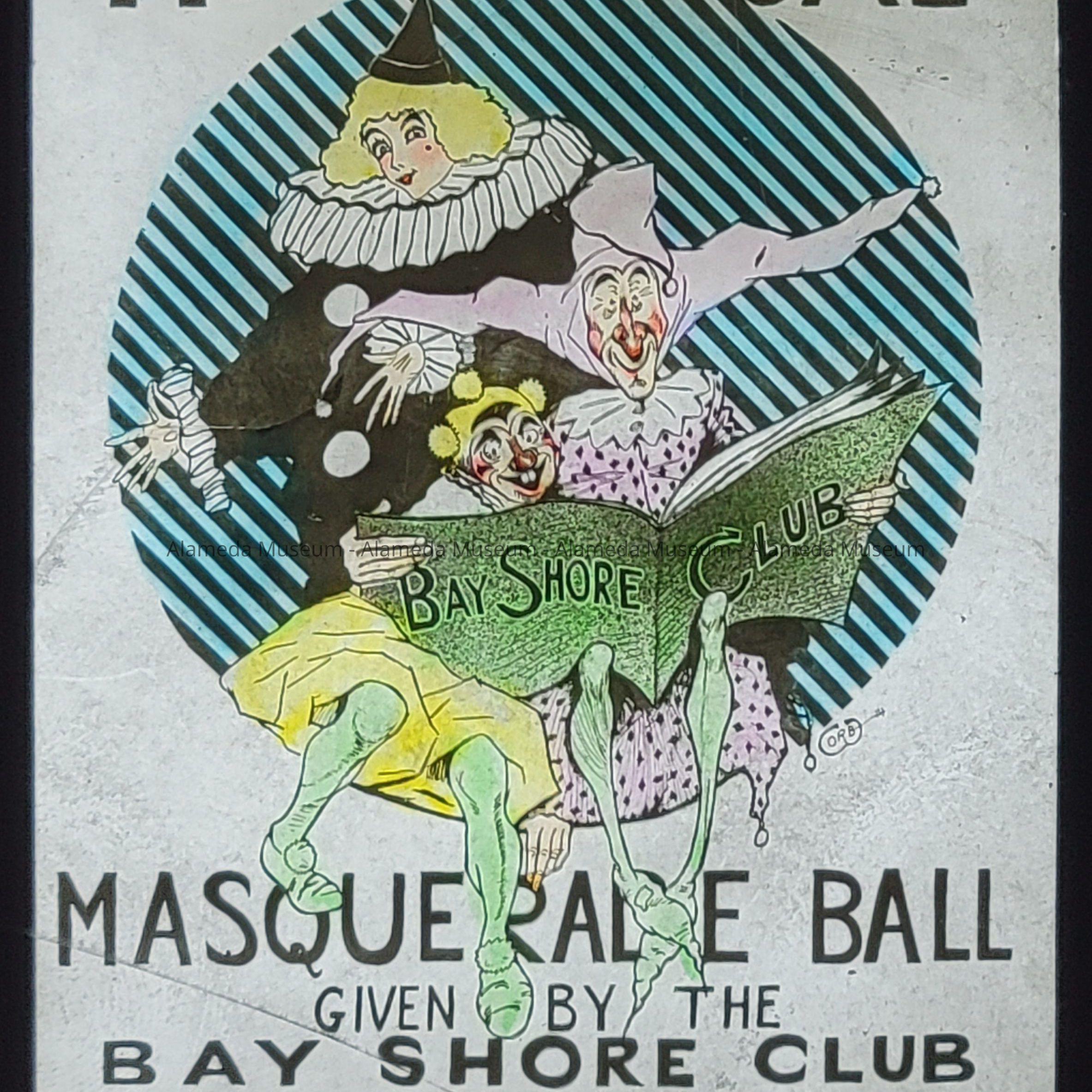 Description: Glass plate color “Magic Lantern” advertising slide for the Bay Shore Club's 11th annual Masquerade Ball at the Encinal Hall, October 31, 1914. The edges of the slide are wrapped in black tape, resembling book binding tape. Three costumed images are shown on black and light blue, vertically striped, round background. A harlequin is reading a book to an unidentified character. A smiling, blond woman, in a black and white clown costume, is standing behind them.